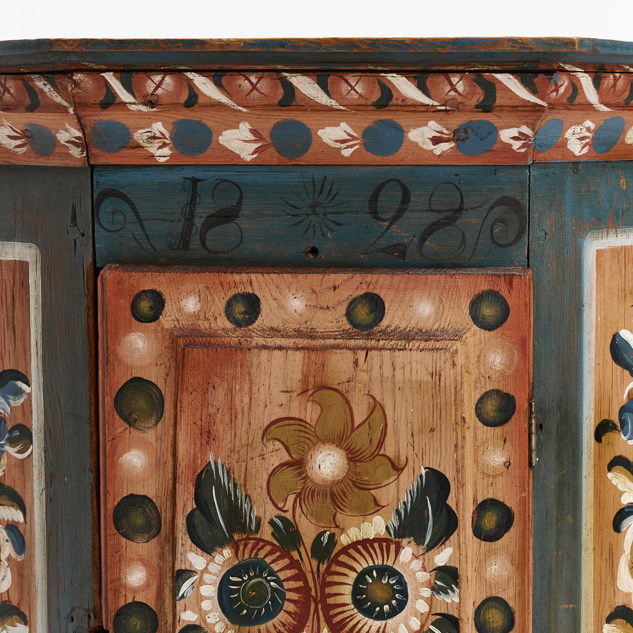 4228593. A CORNER CABINET, Delsbo, Hälsingland, dated 1828, polychrome painted decor with flowers.