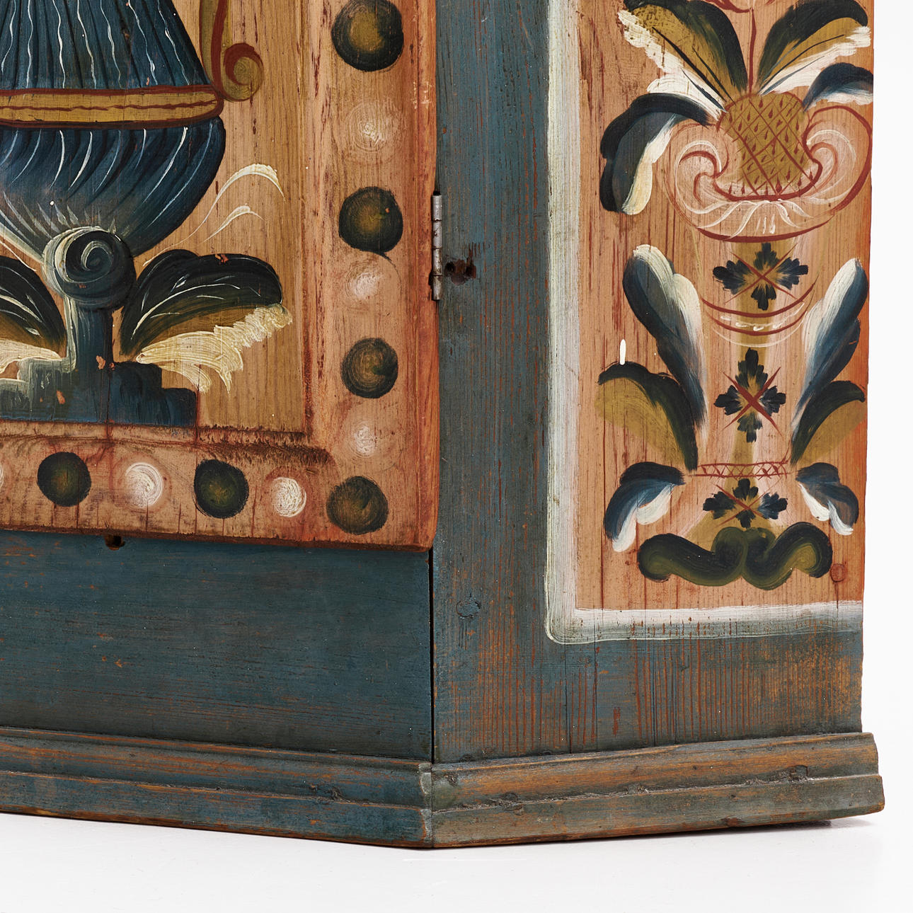 A CORNER CABINET, Delsbo, Hälsingland, dated 1828, polychrome painted decor with flowers.