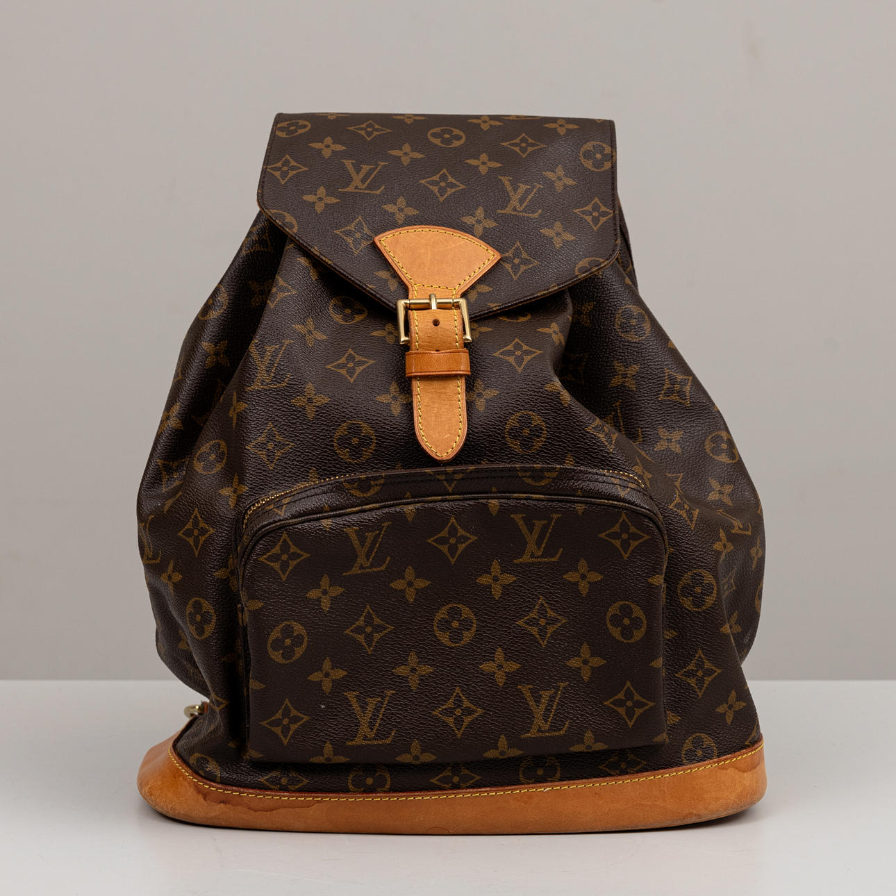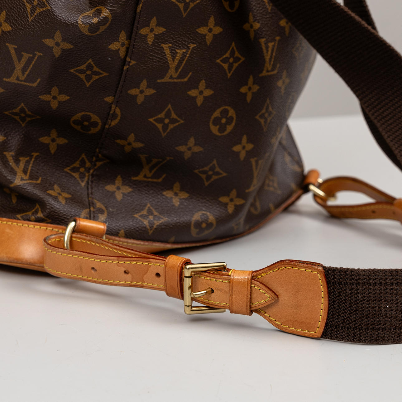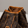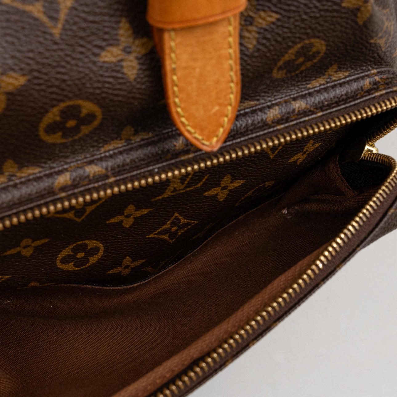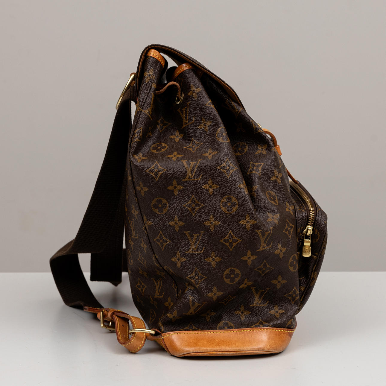 Monogram canvas with details in Vachetta leather and god-colored metal. Adjustable shoulder straps, One inner pocket and outer pocket with zipper. D-ring. Tagged with date code (year 1998) and “LOUIS VUITTON made in France”. Height approx. 36 cm, width approx. 32 cm.