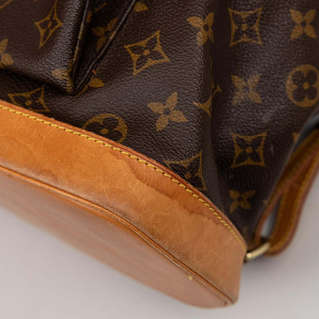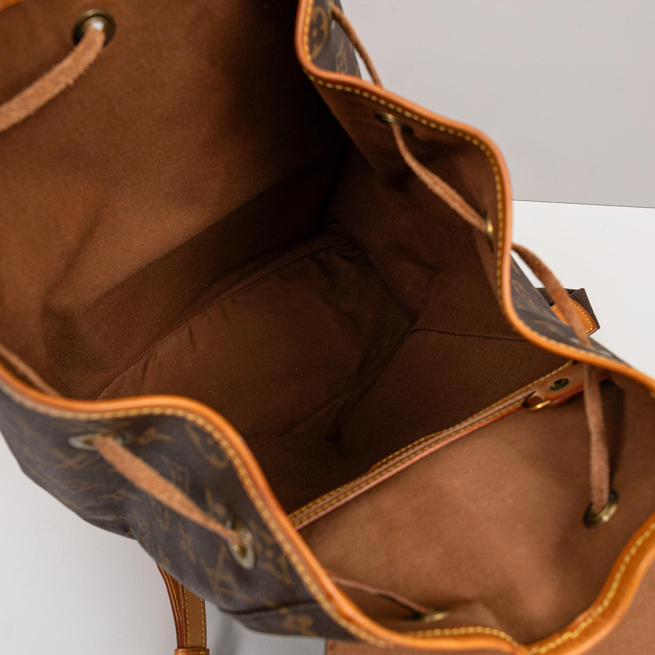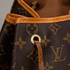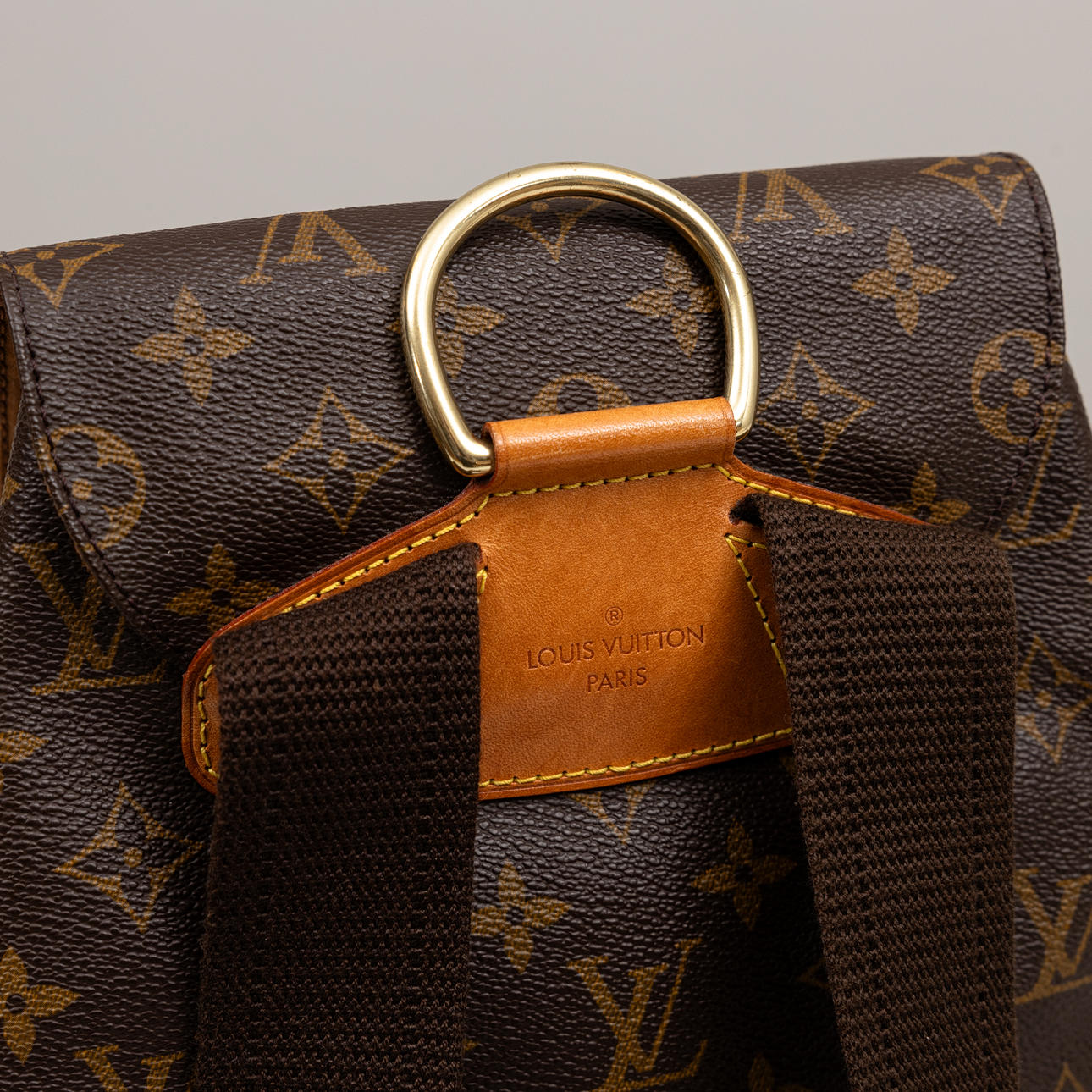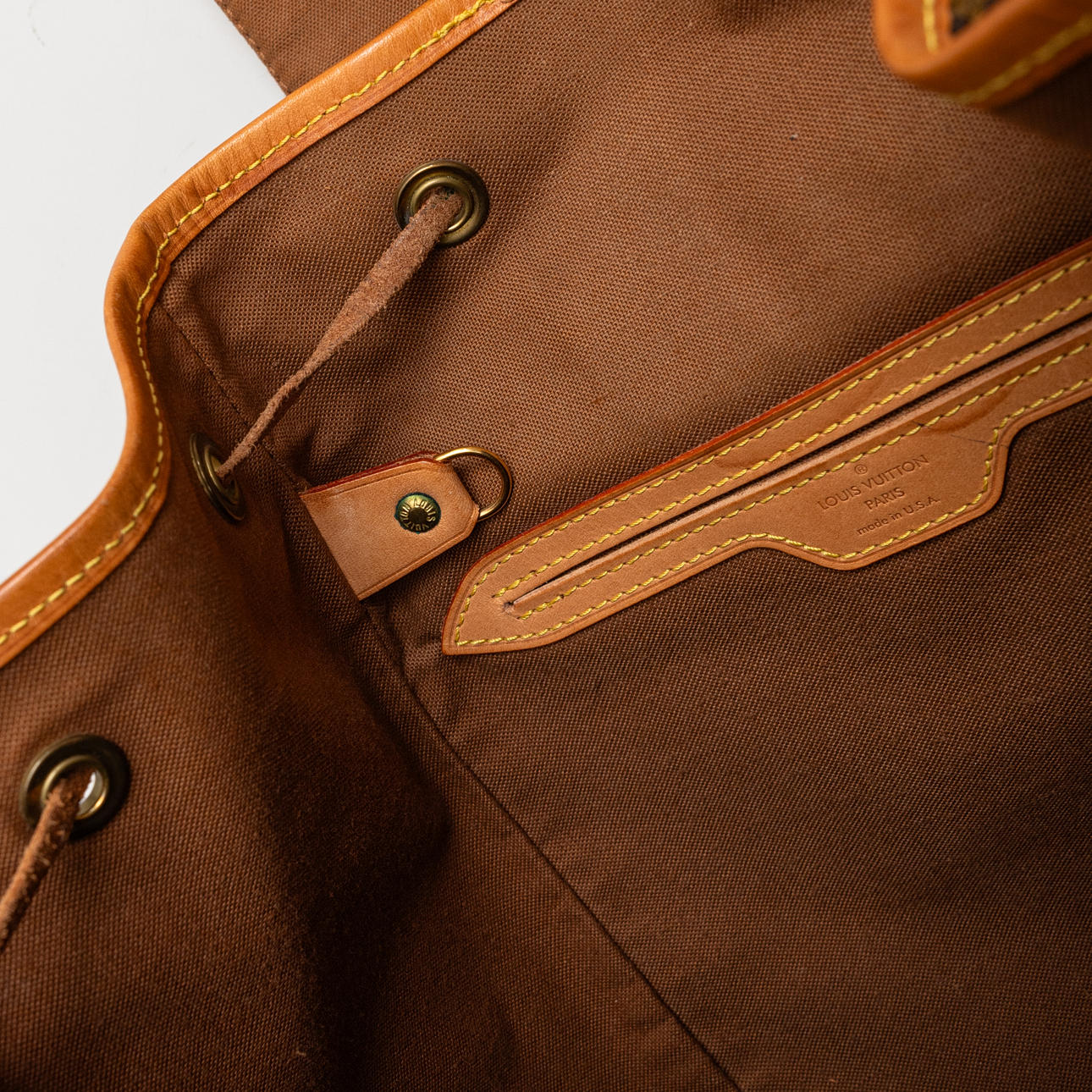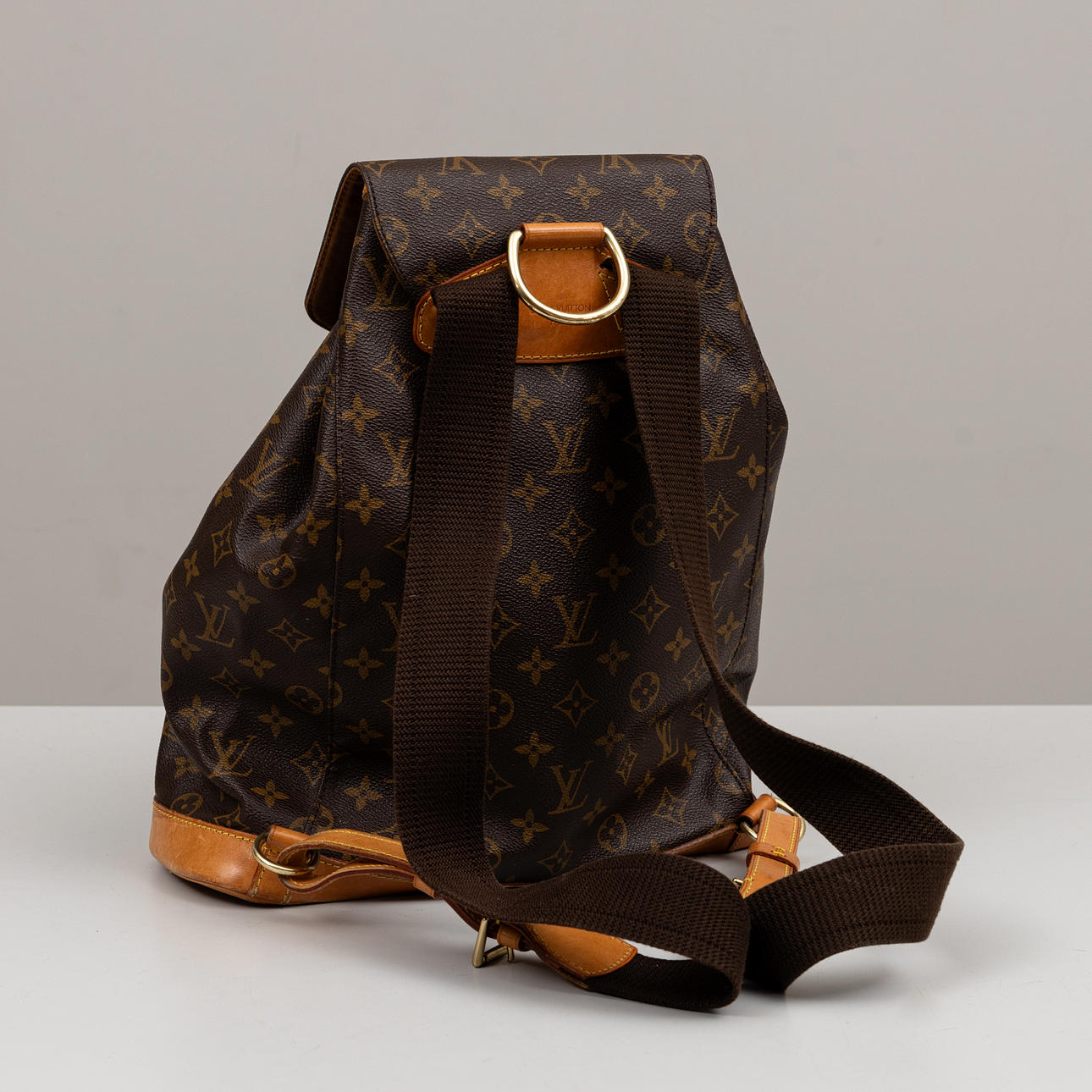 Monogram canvas with details in Vachetta leather and god-colored metal. Adjustable shoulder straps, One inner pocket and outer pocket with zipper. D-ring. Tagged with date code (year 1998) and “LOUIS VUITTON made in France”. Height approx. 36 cm, width approx. 32 cm.