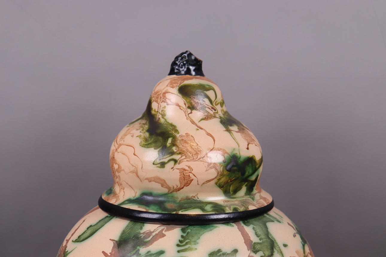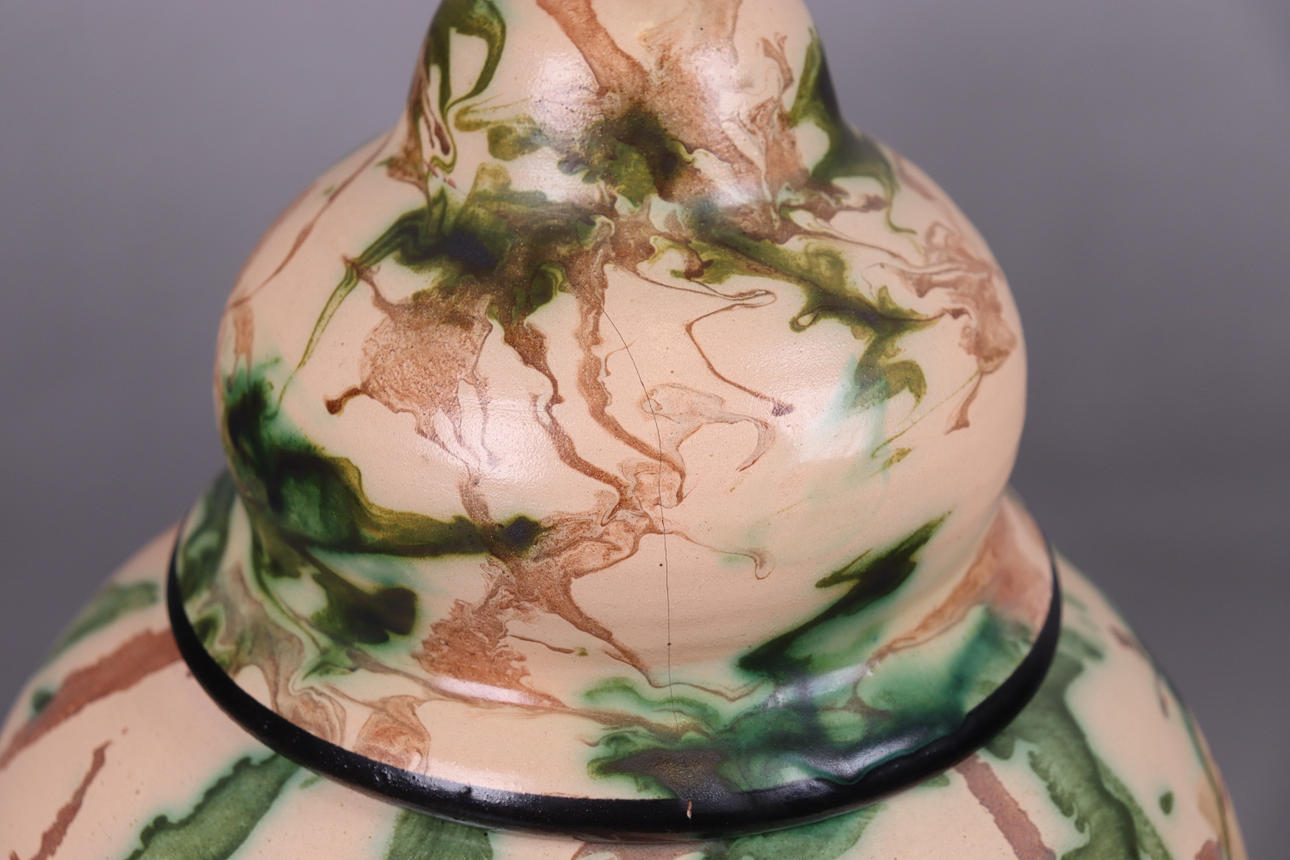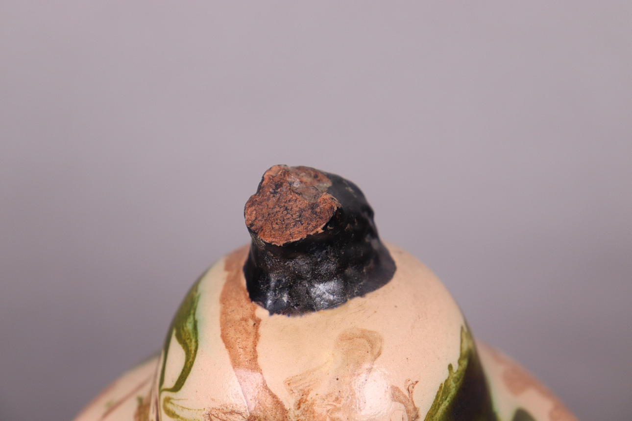 Normal wear and tear, damage to the top (originally a bird crowned the urn), crack in the lid.