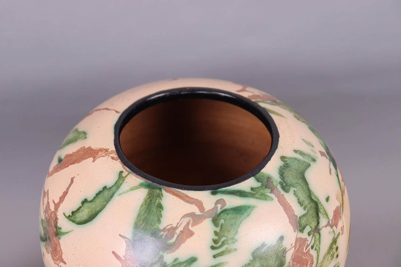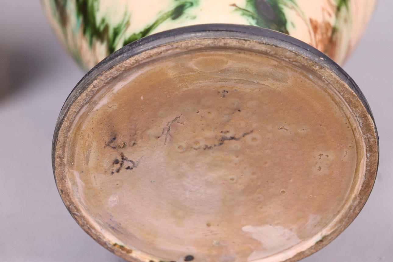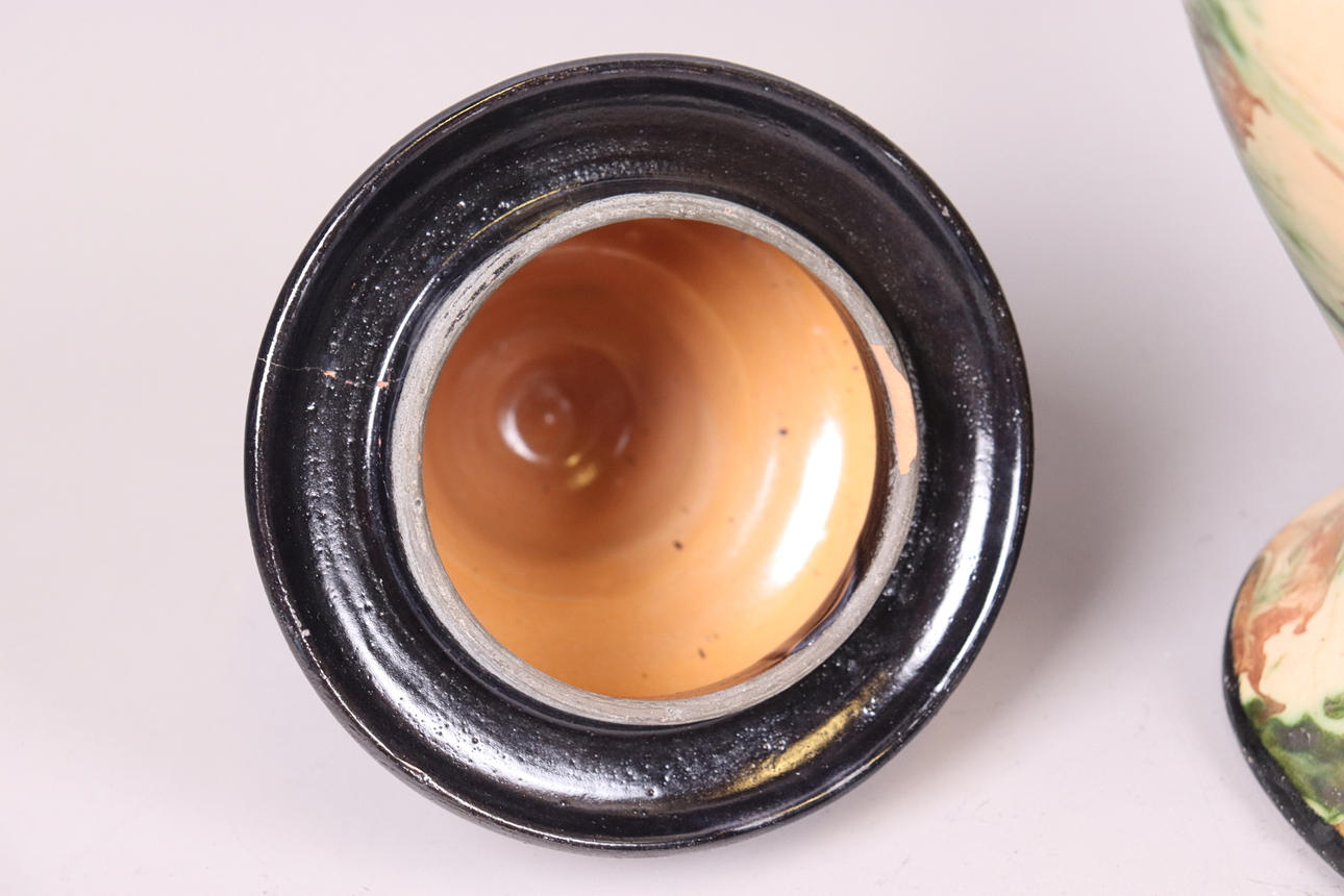 Normal wear and tear, damage to the top (originally a bird crowned the urn), crack in the lid.