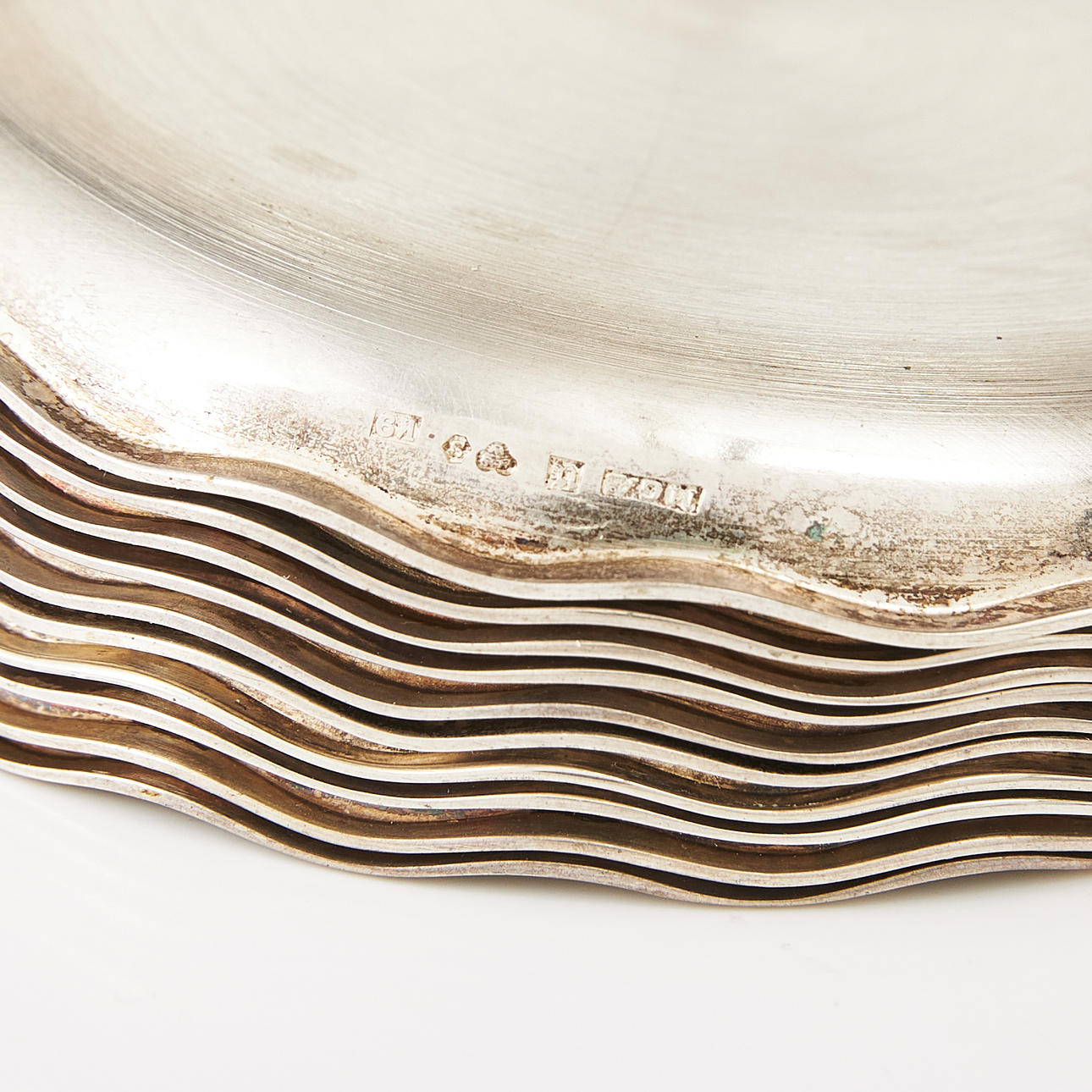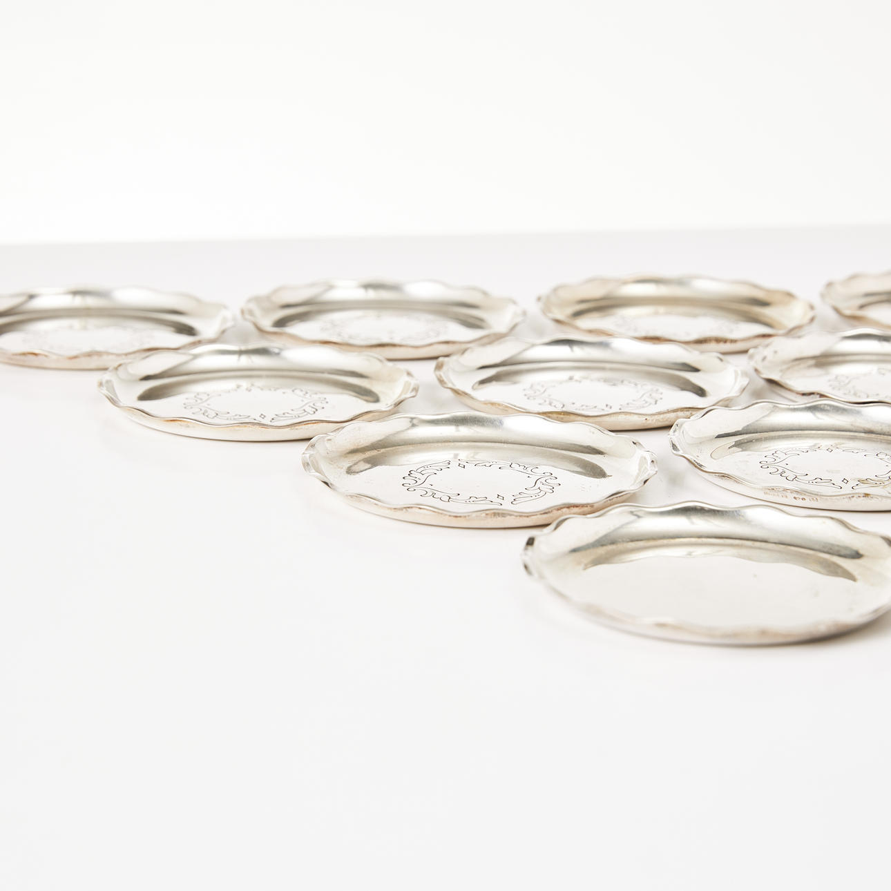 4230943. COASTERS, 10 pcs, silver, wavy brim, 9 pcs with leaf decor.