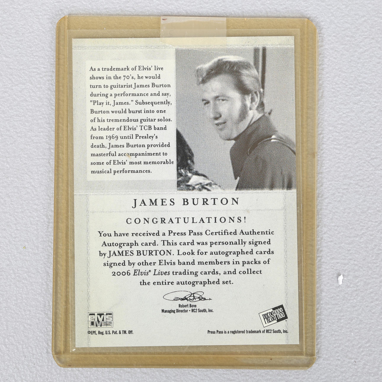 A Certified Autograph card signed by Elvis Presley guitarist James Burton, signed in ink below a picture of The King and Burton jamming, with information on the guitarist to the reverse, card measures approx. 9cm x 6.5cm.