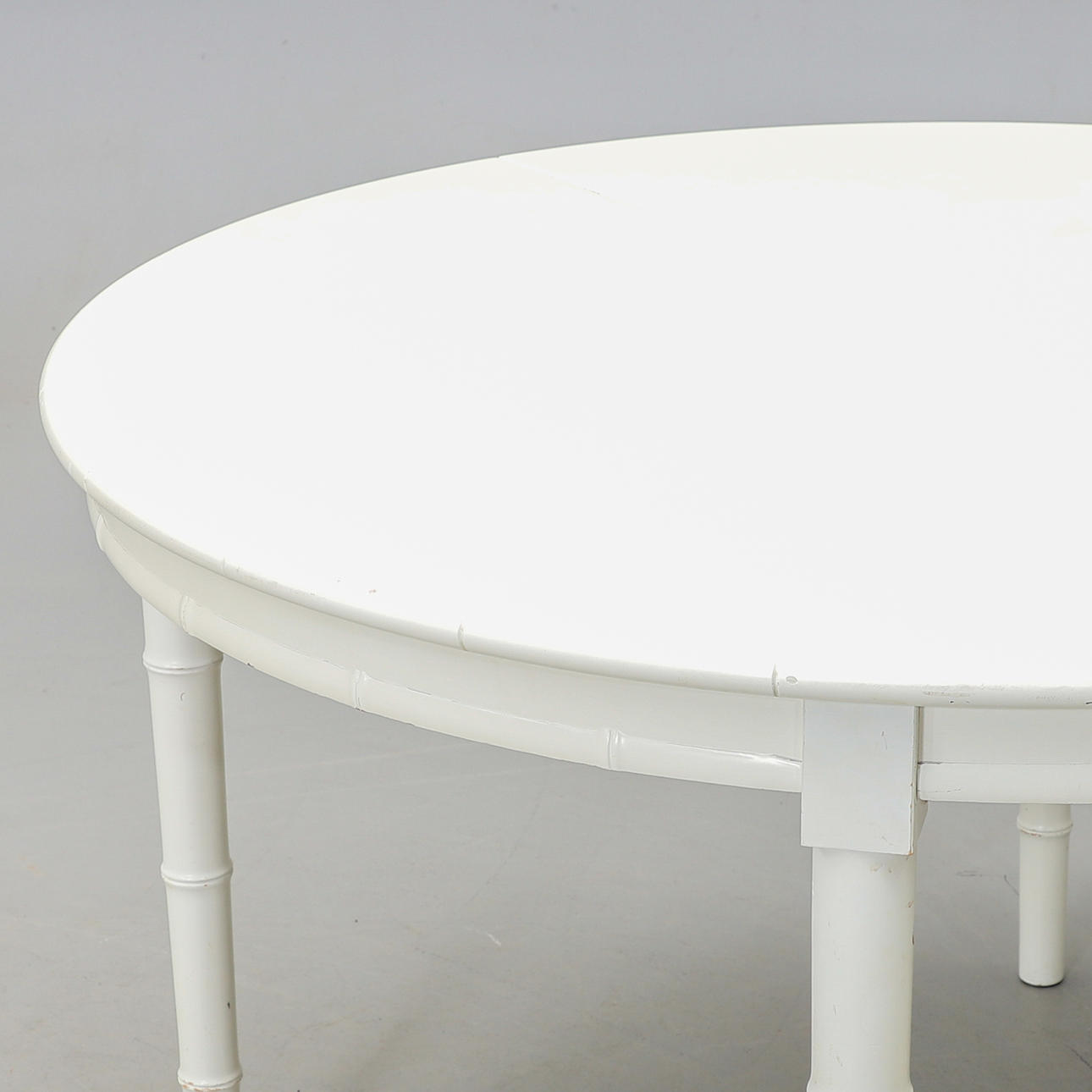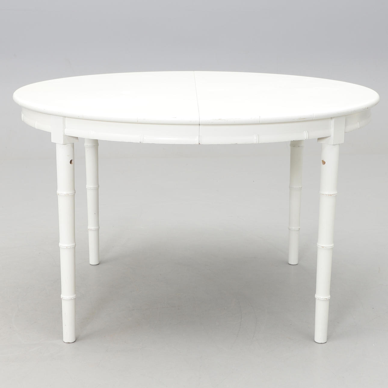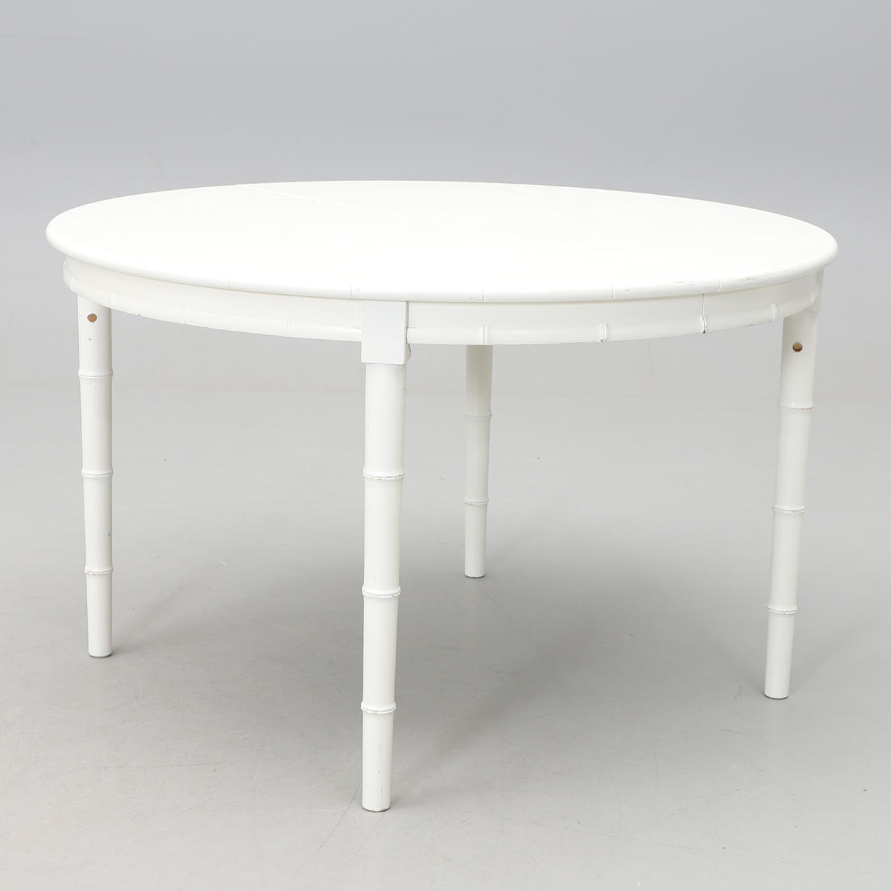 White lacquered round dining table with 2 inserts of 50 cm. Diameter 120 (length with insert plates 220 cm), height 73 cm.