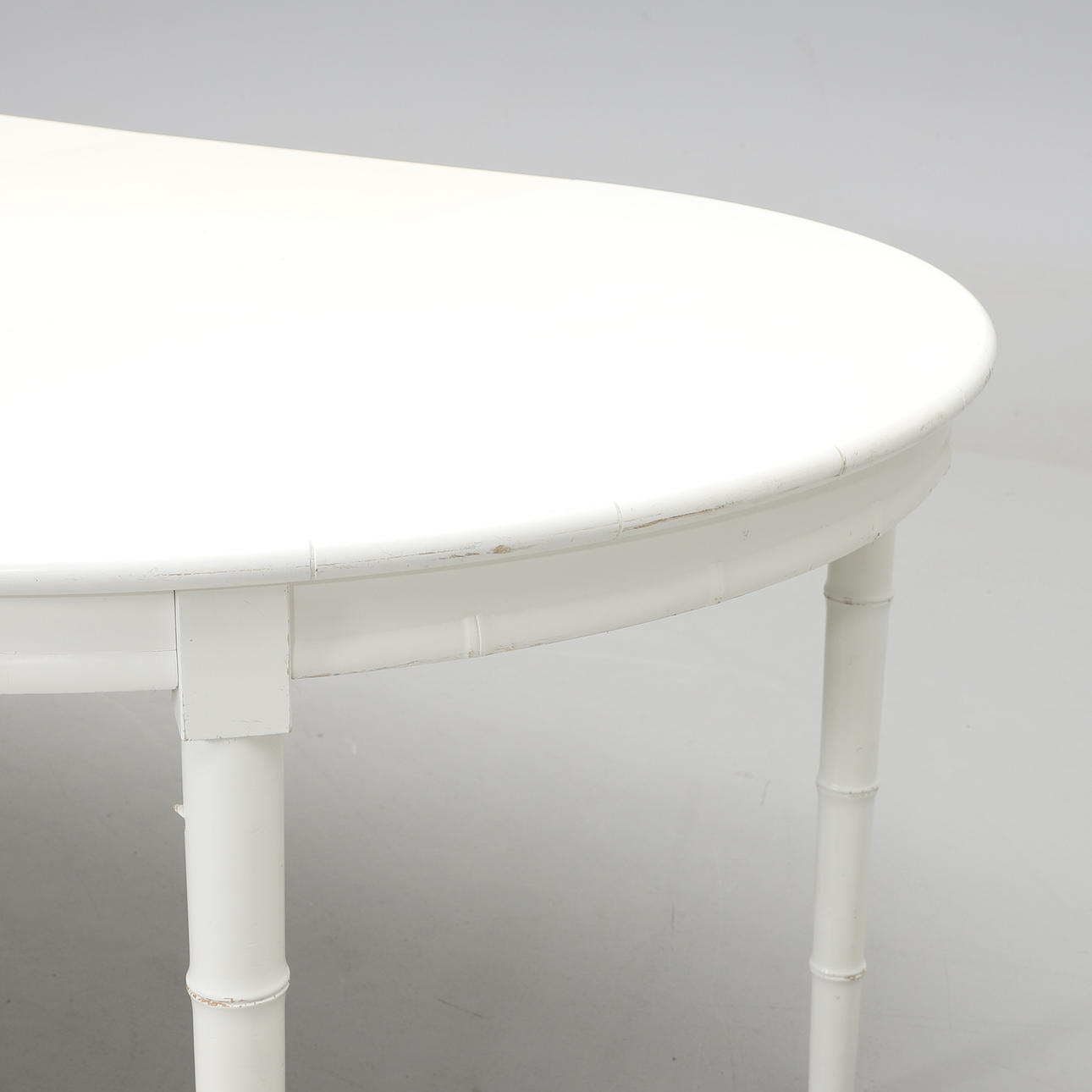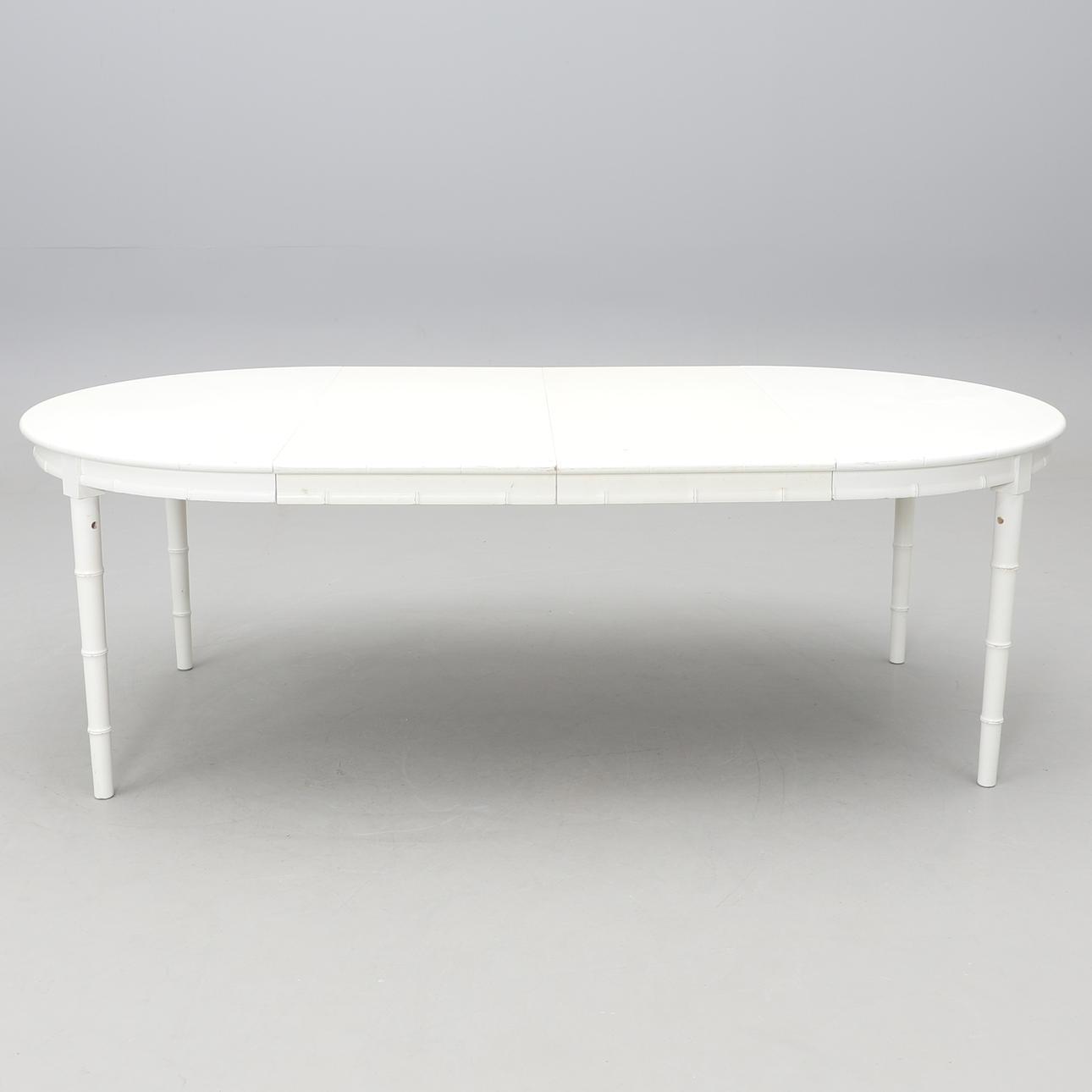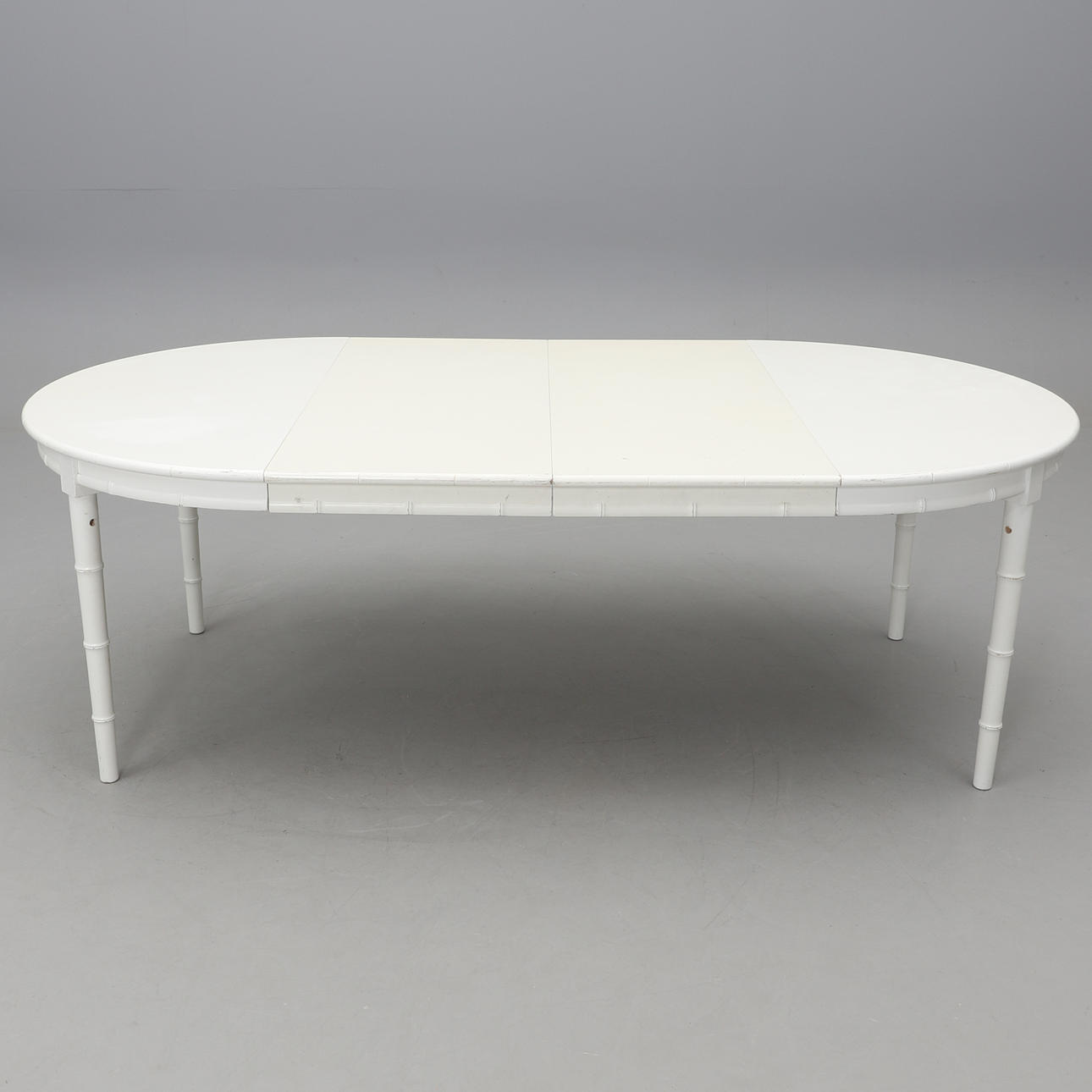 White lacquered round dining table with 2 inserts of 50 cm. Diameter 120 (length with insert plates 220 cm), height 73 cm.