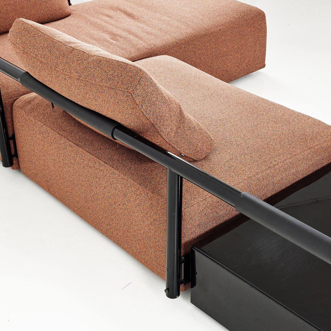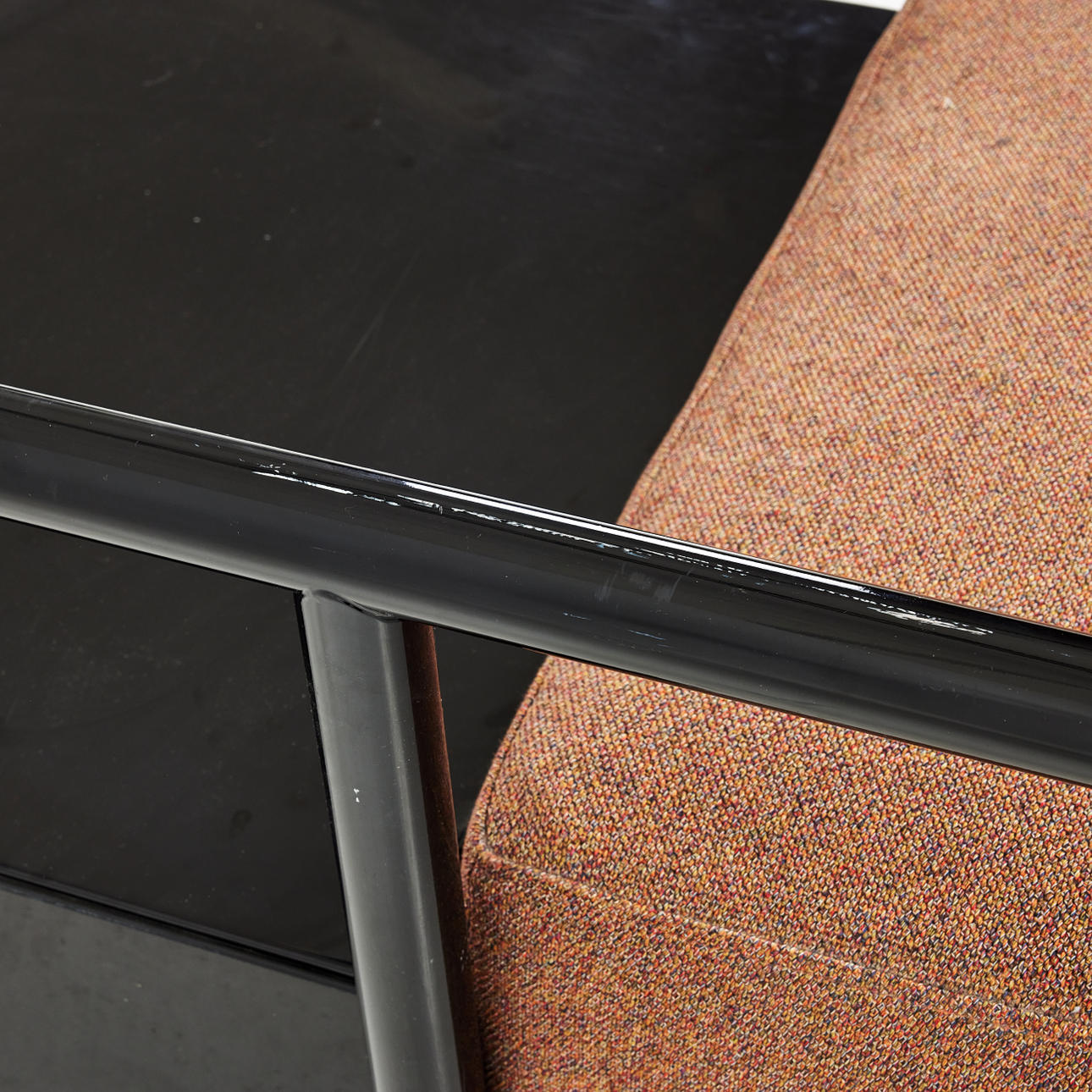 Lacquered steel tube, textile upholstered seat, 3 cushions.