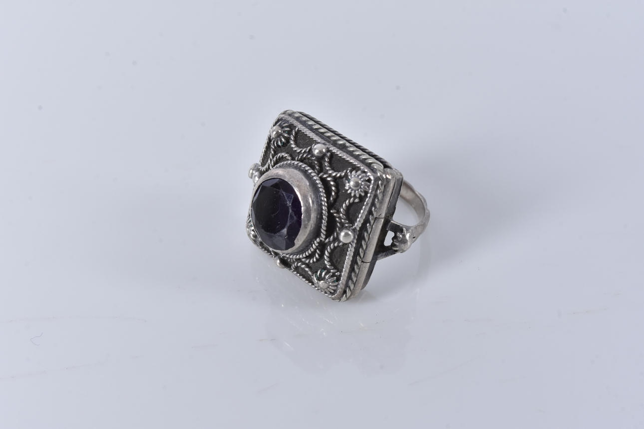 4236445. RING, with photo hide, and purple stone, silver.