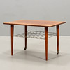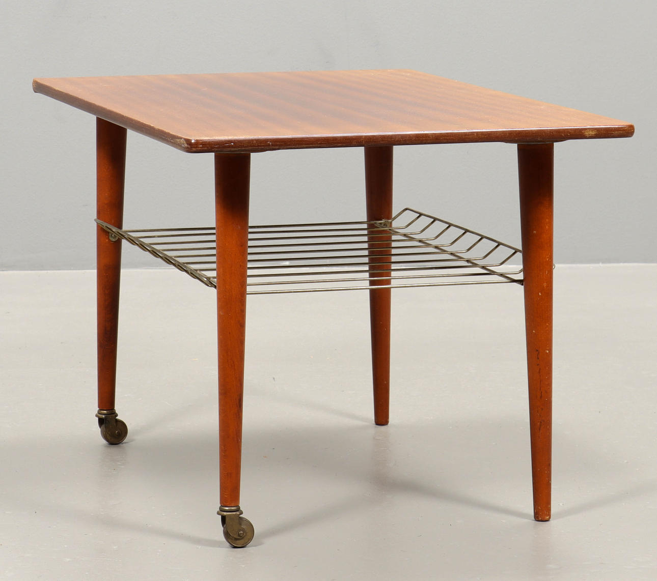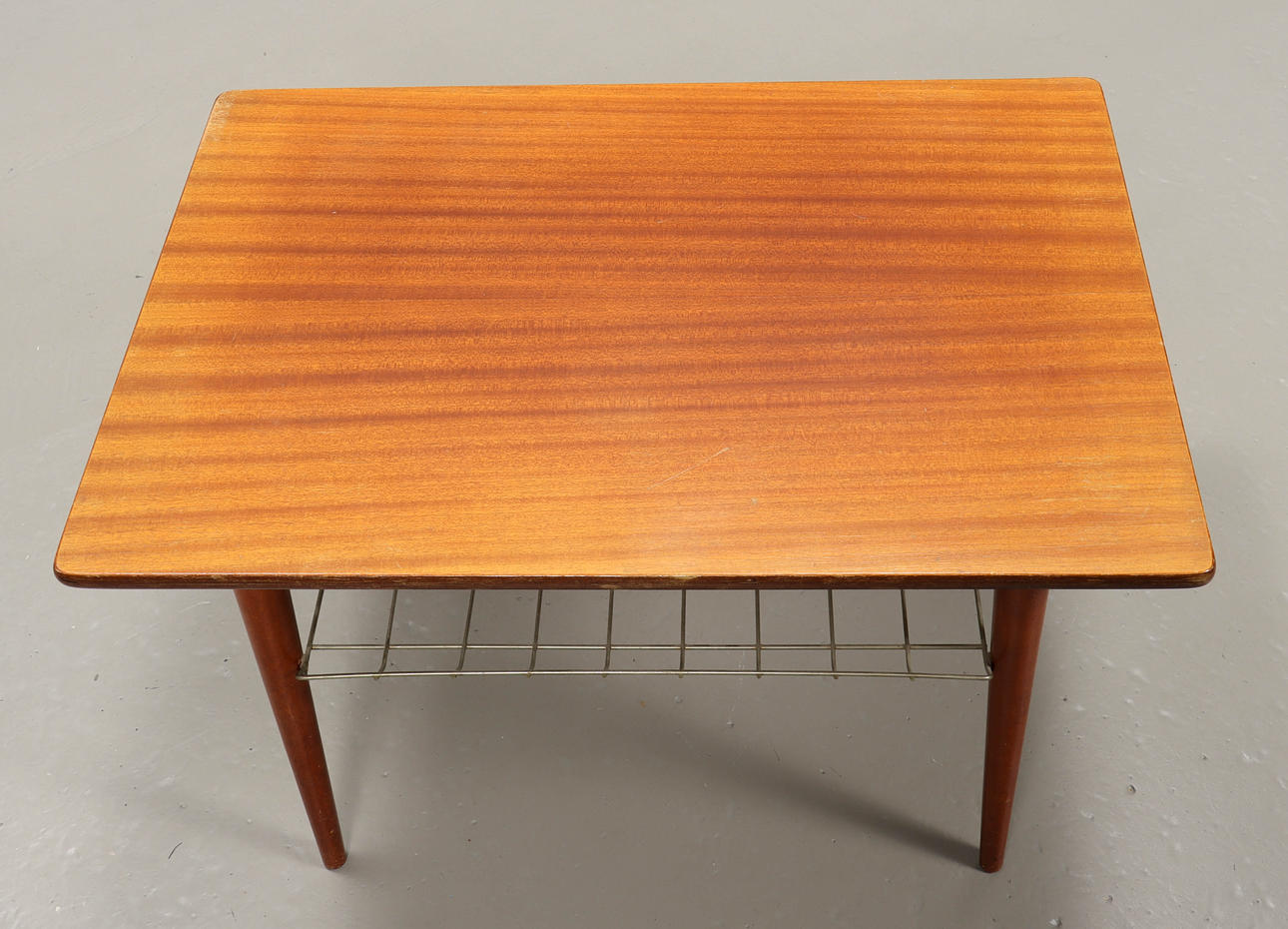 Veneered with mahogany, brass lower magazine shelf. 1 pair of legs on carousels.