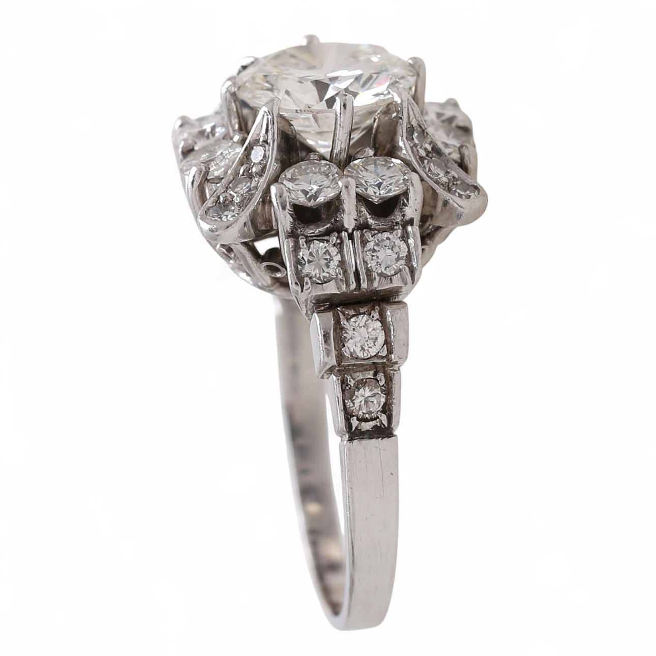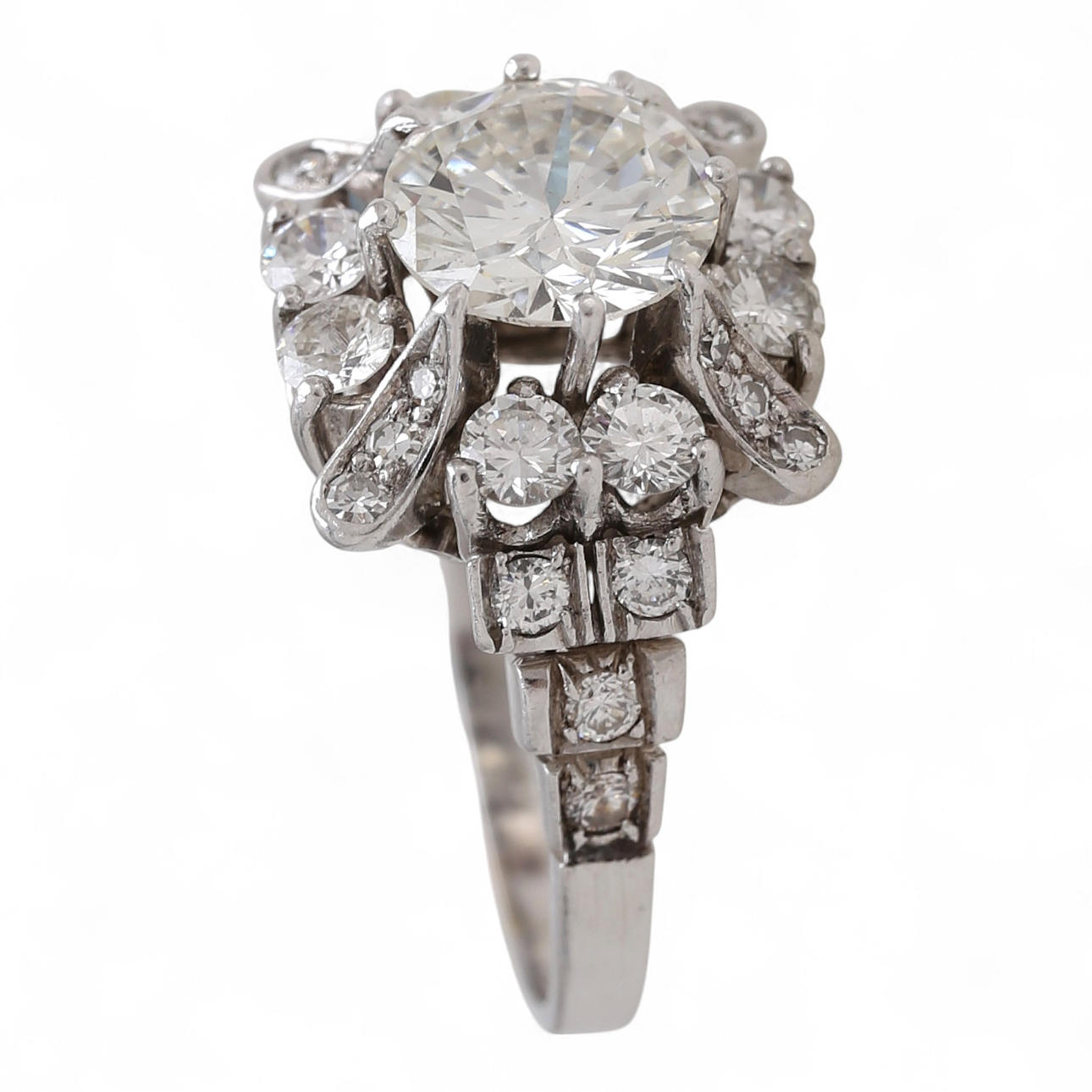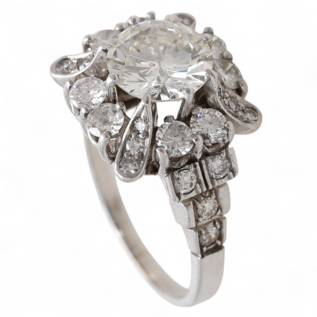 Platinum, brilliant cut central diamond, approx. 1.85 cts., I colour approx. and SI clarity approx., and other brilliant and 8/8 cut diamonds, 1.18 cts approx. Size 14/54. 9.5 gr.