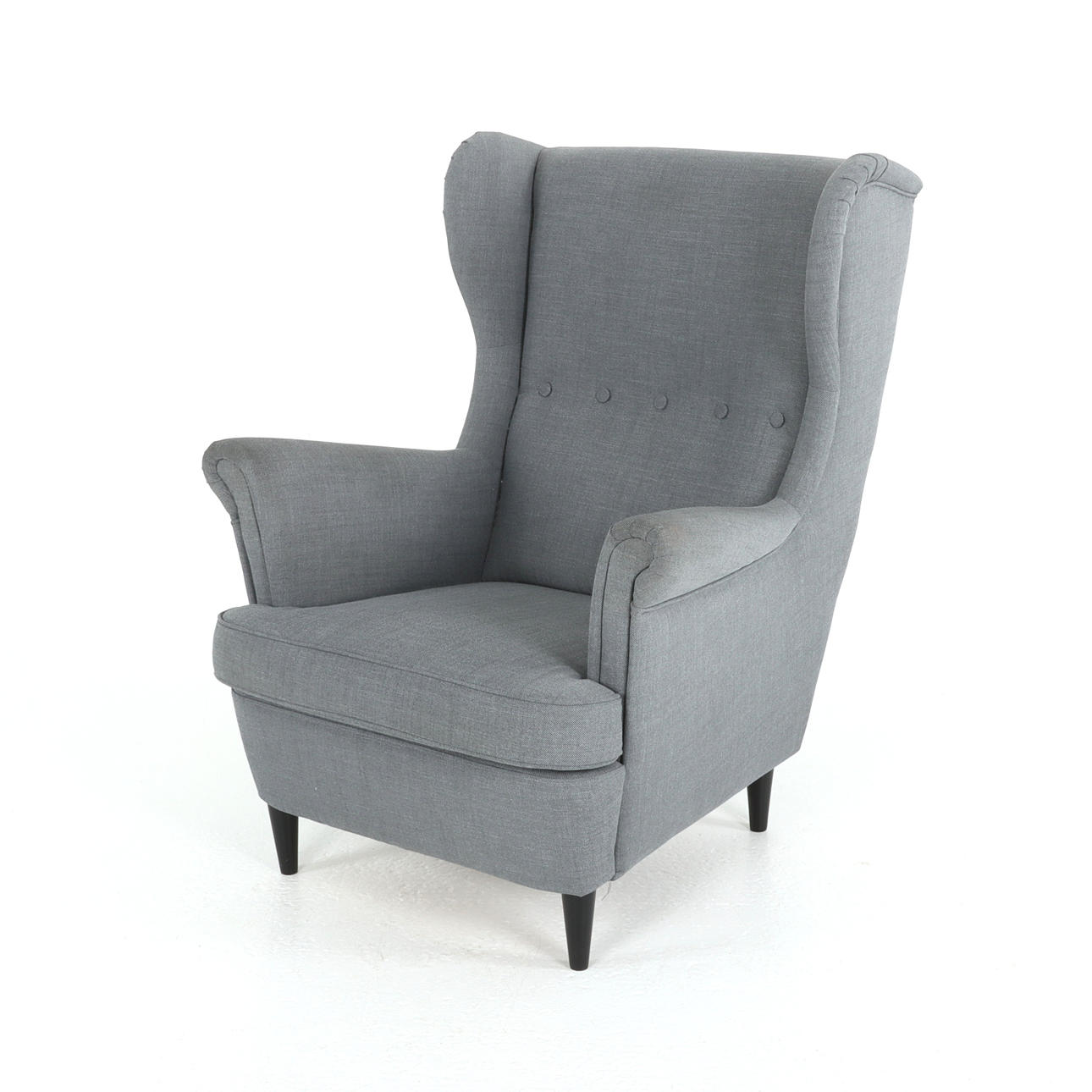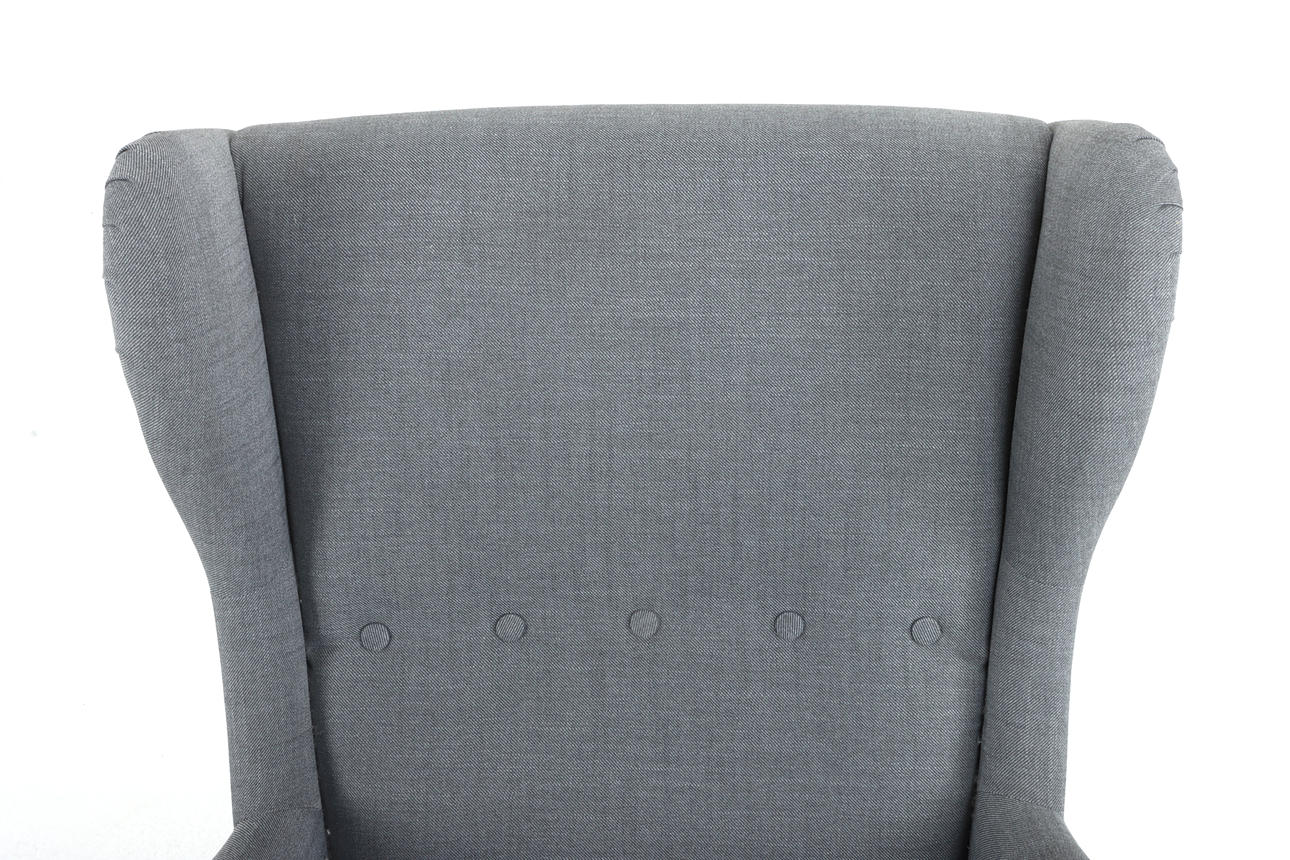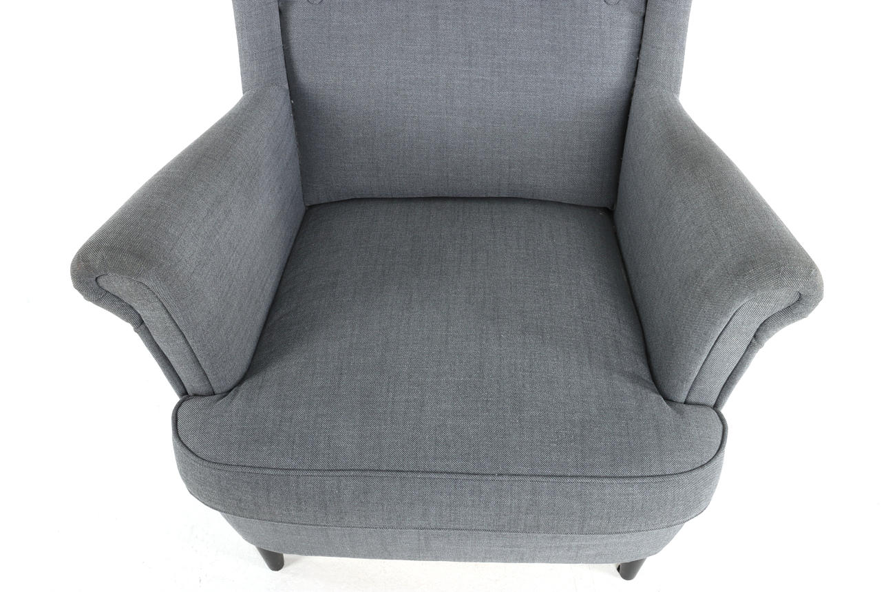 Ear patch armchair with footstool, “Strandmon”, gray textile upholstery. Height 106 cm Width 75 cm pallet dimensions approx. 60 x 40 cm.
