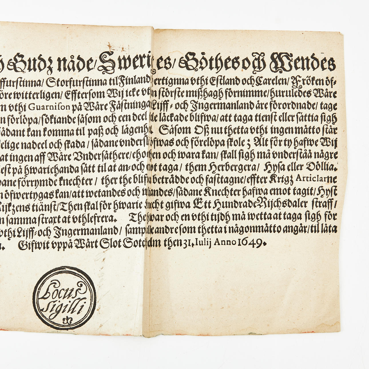 Wij Christina, medh Gudz Naadhe, Sweriges, Göthes and Wendes vthkoradhe Queen and Arffurstinna (...) Finnish knechts are particularly those who guard our fortresses in Lijf- and Ingermanland (..) to take the trouble before it passes. Stockholm Castle July 31, 1649.