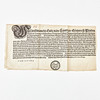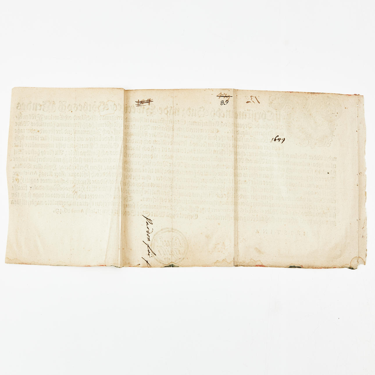 185 x 380 mm. One-leaf print dates 31 July 1649, folded twice some small spots and smaller holes in the left margin after binding. Narrowly cut.