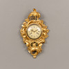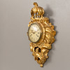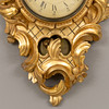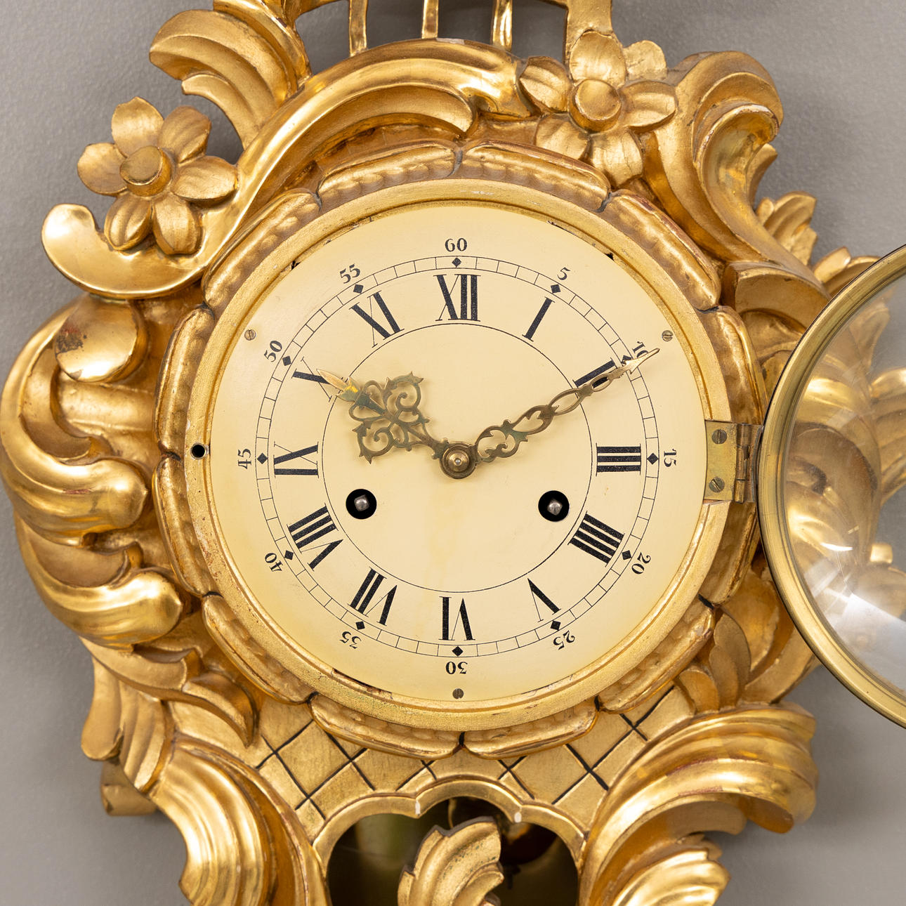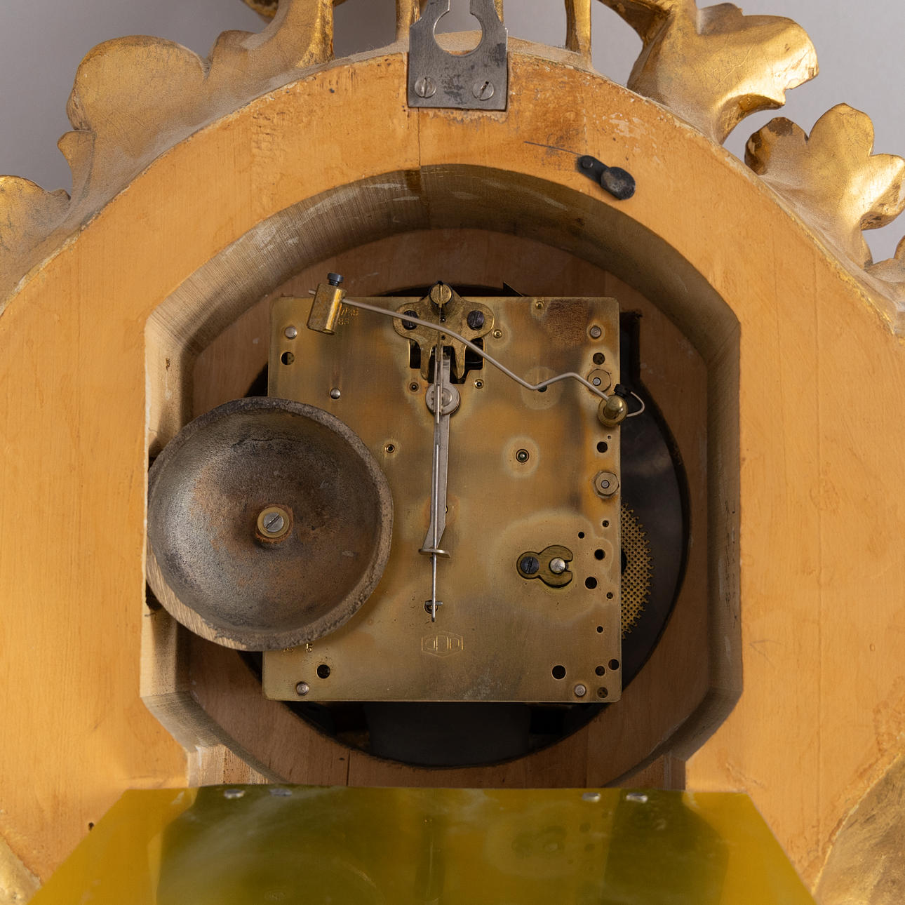 Wall clock with cabinet in carved wood with pastellage, gilded and bronzed. Weight marked ODO