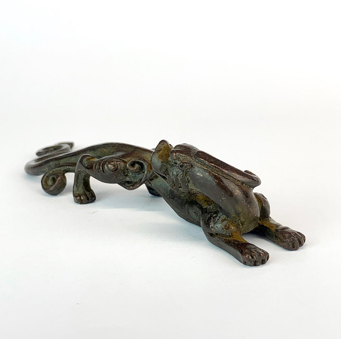 A Chinese bronze dragon shaped scroll weight, L. 16cm.