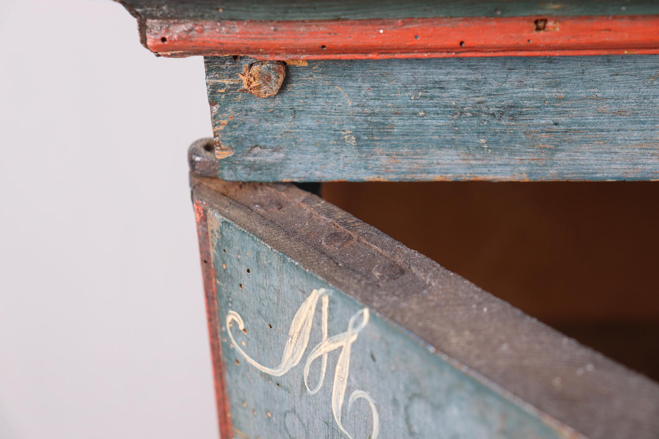 Straight model, dated 1838, original painting, interior compartments and drawers, smaller maple compartments under large bottom drawer.