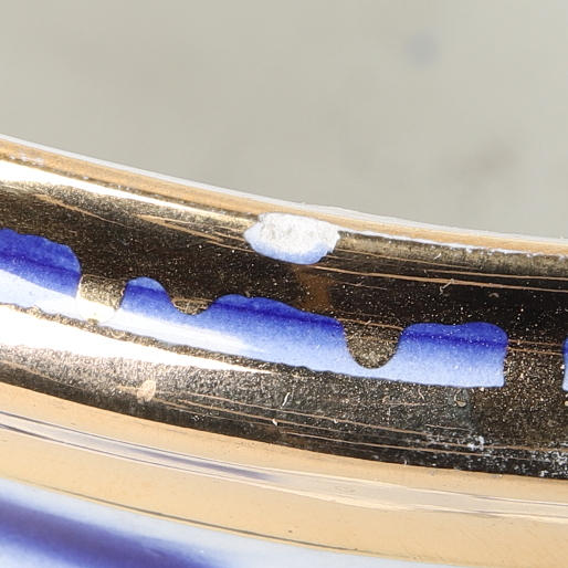 Normal wear and tear, dirt, minor edge chips.