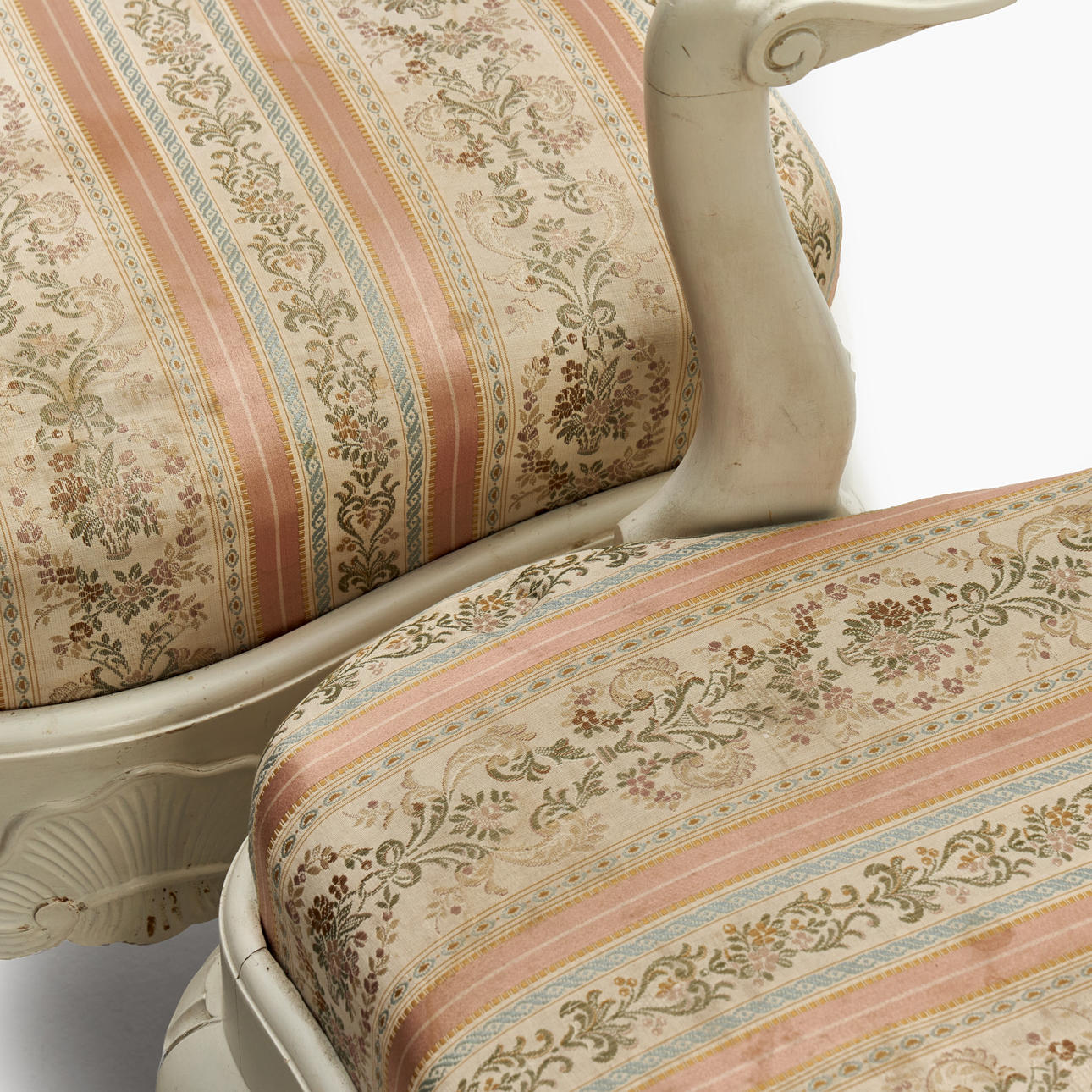 cut decor and rocailles, pierced back, coupled leg position and upholstered fixed seat cushions with fabric upholstery.