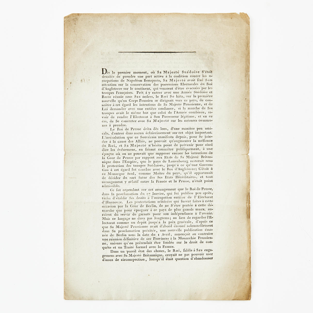 VON FERSEN, SHOULDER. Letter, the introduction in free translation “From the first moment, when his kongl. The Swedish May had decided to take an active part in the coalition against Napoléon Bonaparte's violence”. Signerkand “Sralsund ce 27 avril 1806, Le comte de Fersen, Grand Maréchal du Royaume de Suède”. 4 pages (2 blank) 300 x 195 mm.