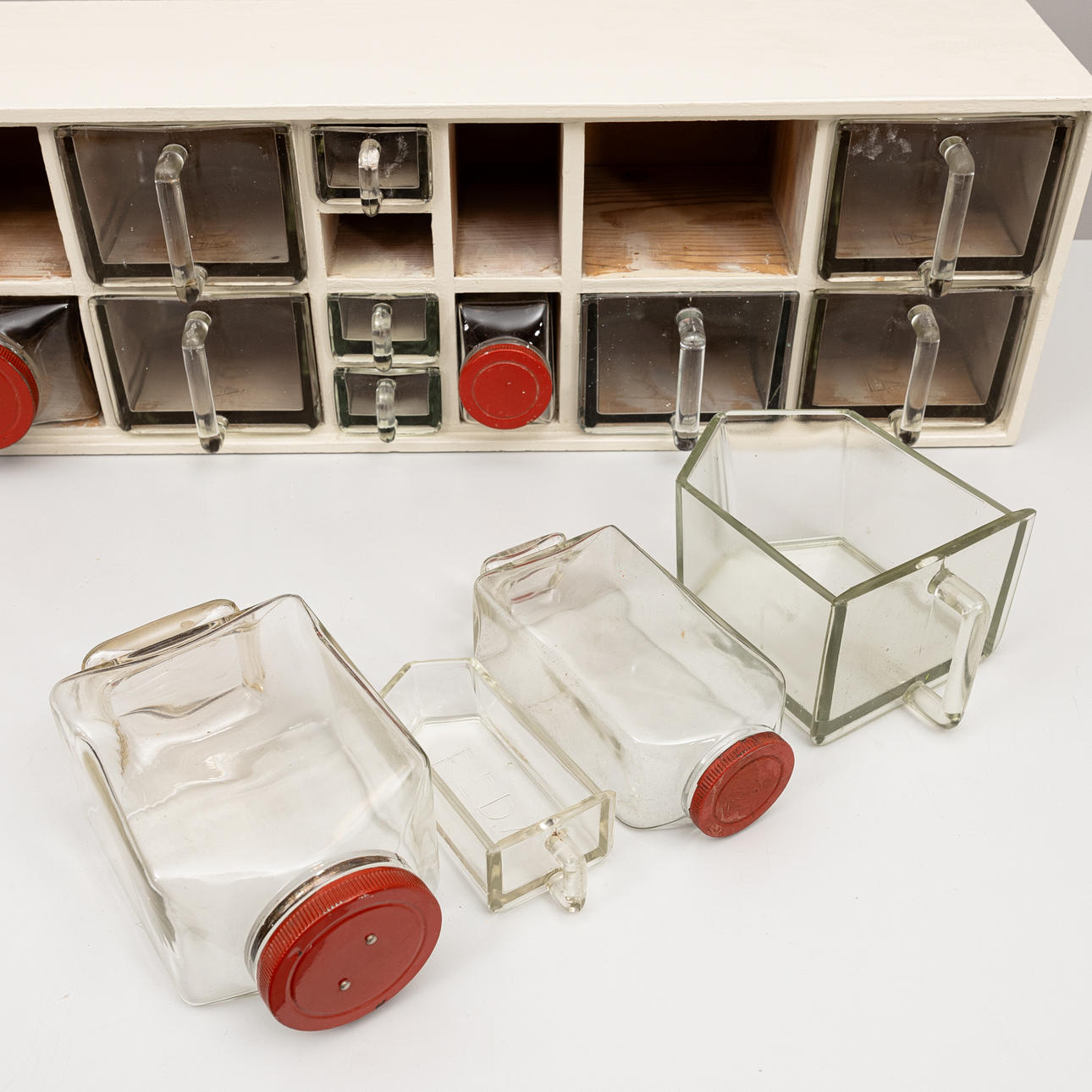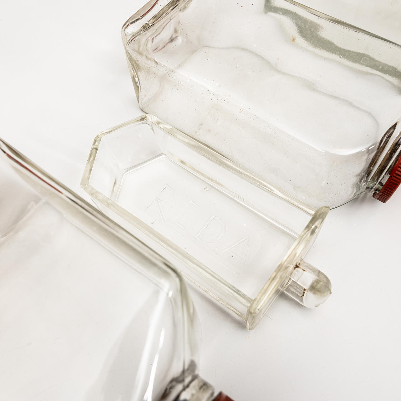 14 glass containers including 4 bottles with lids. The dimensions of the cutters are approx. 14x6.5 and 17.5x13.5 cm respectively.