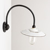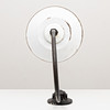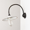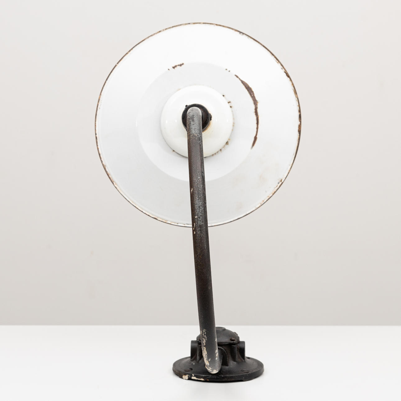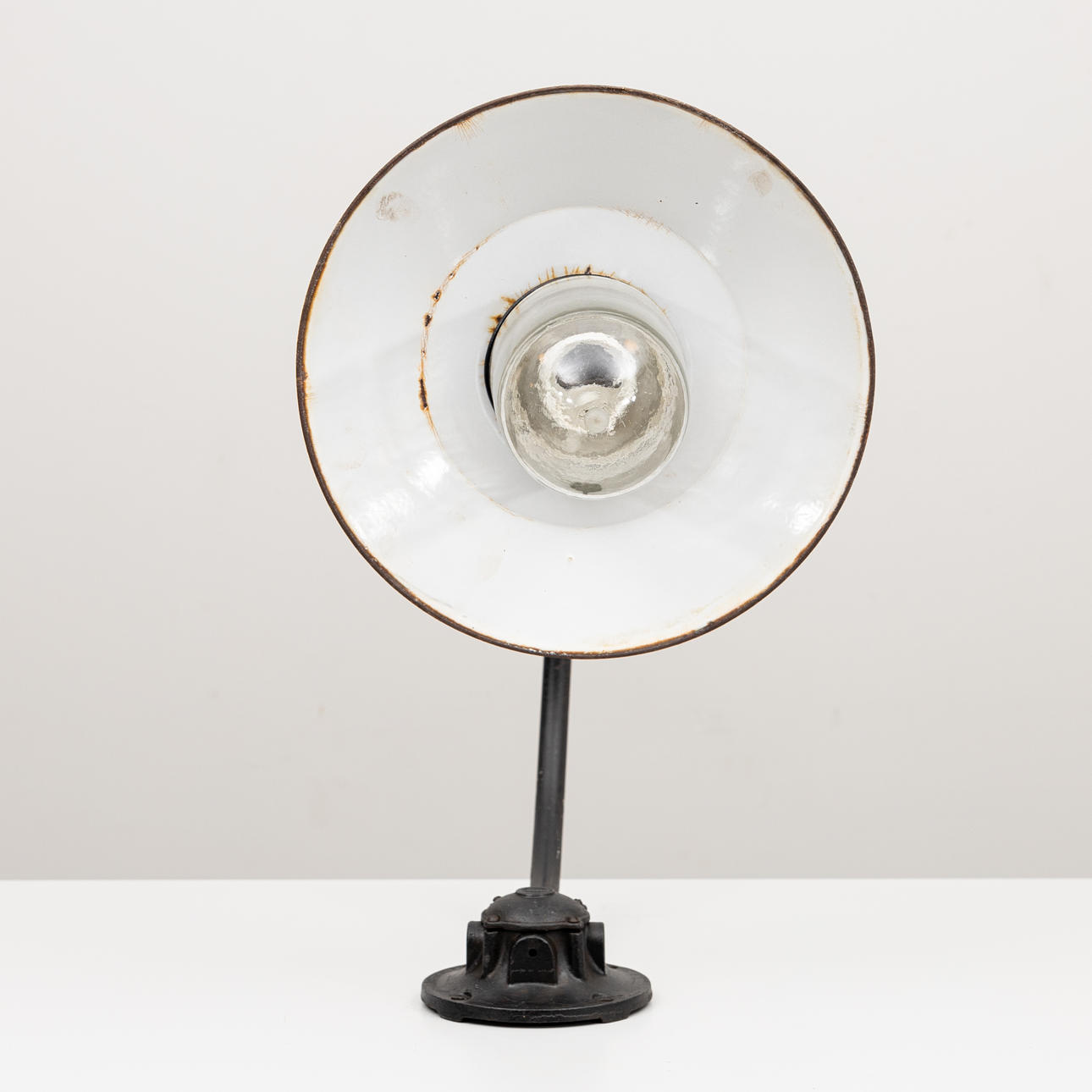 Black lacquered iron arm with white enamelled plate screen and glass cup, height 55 cm.