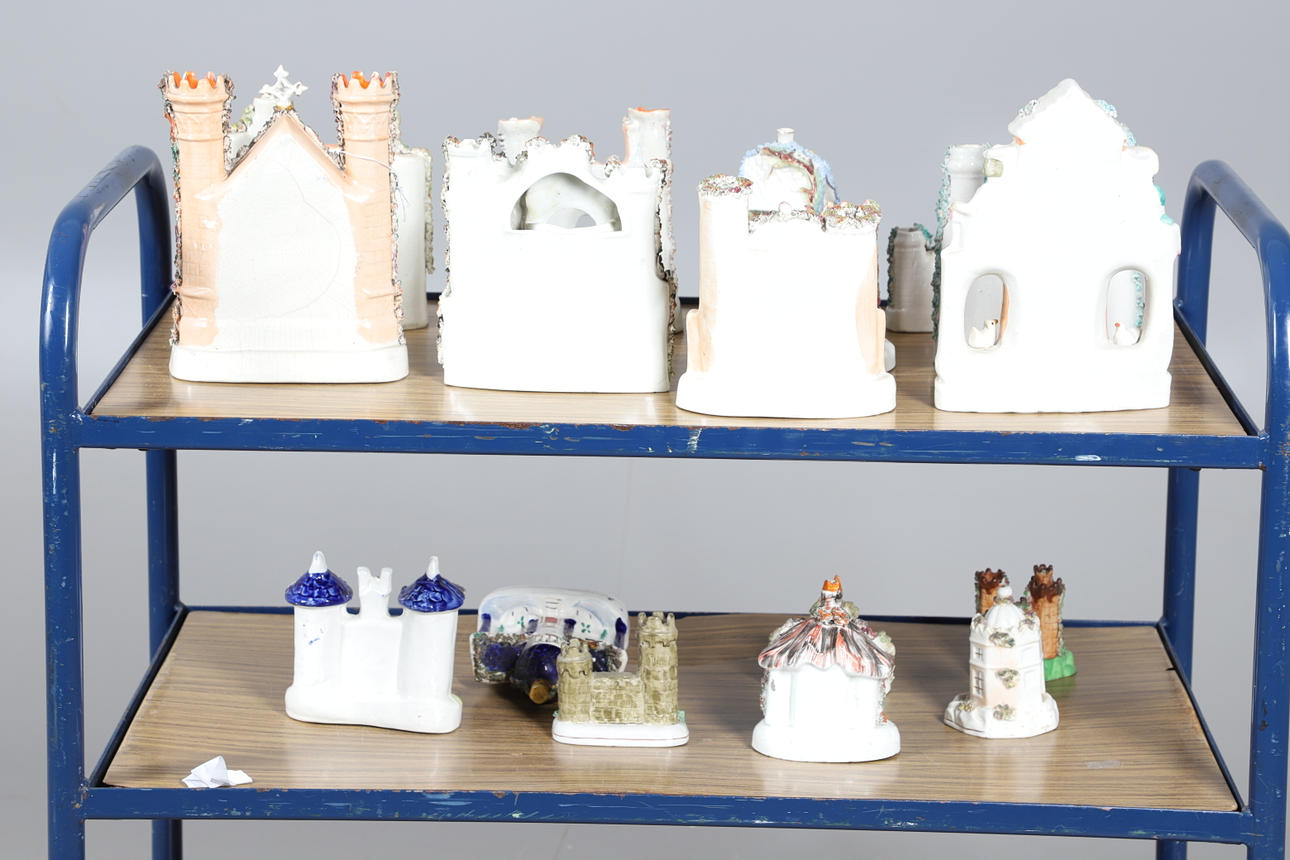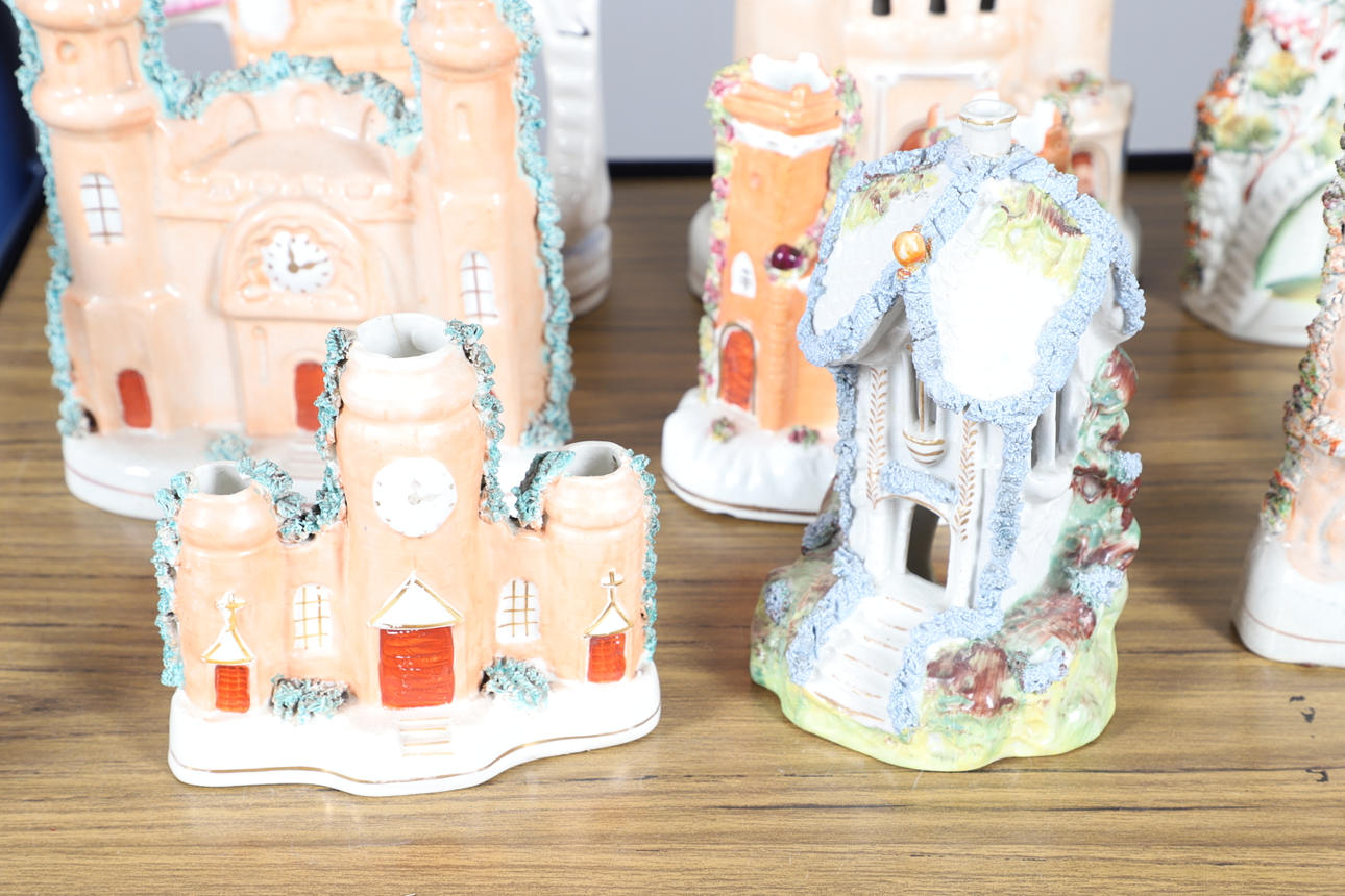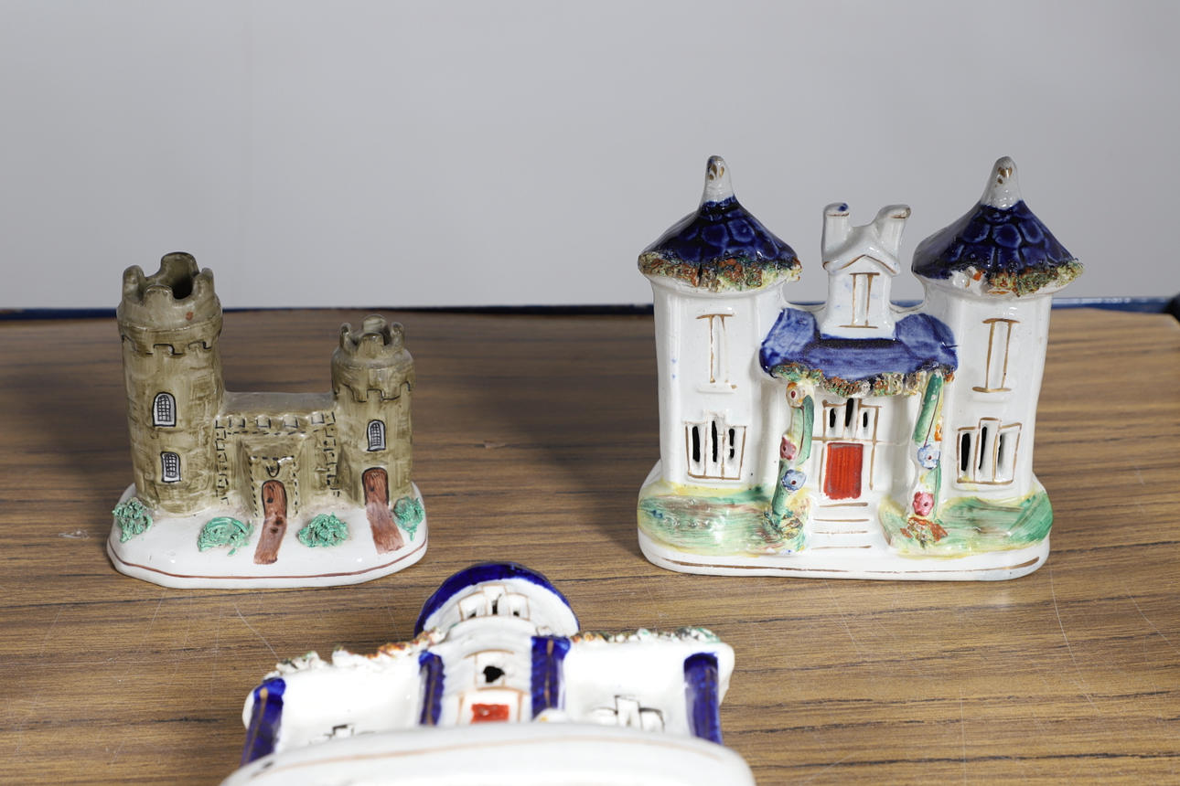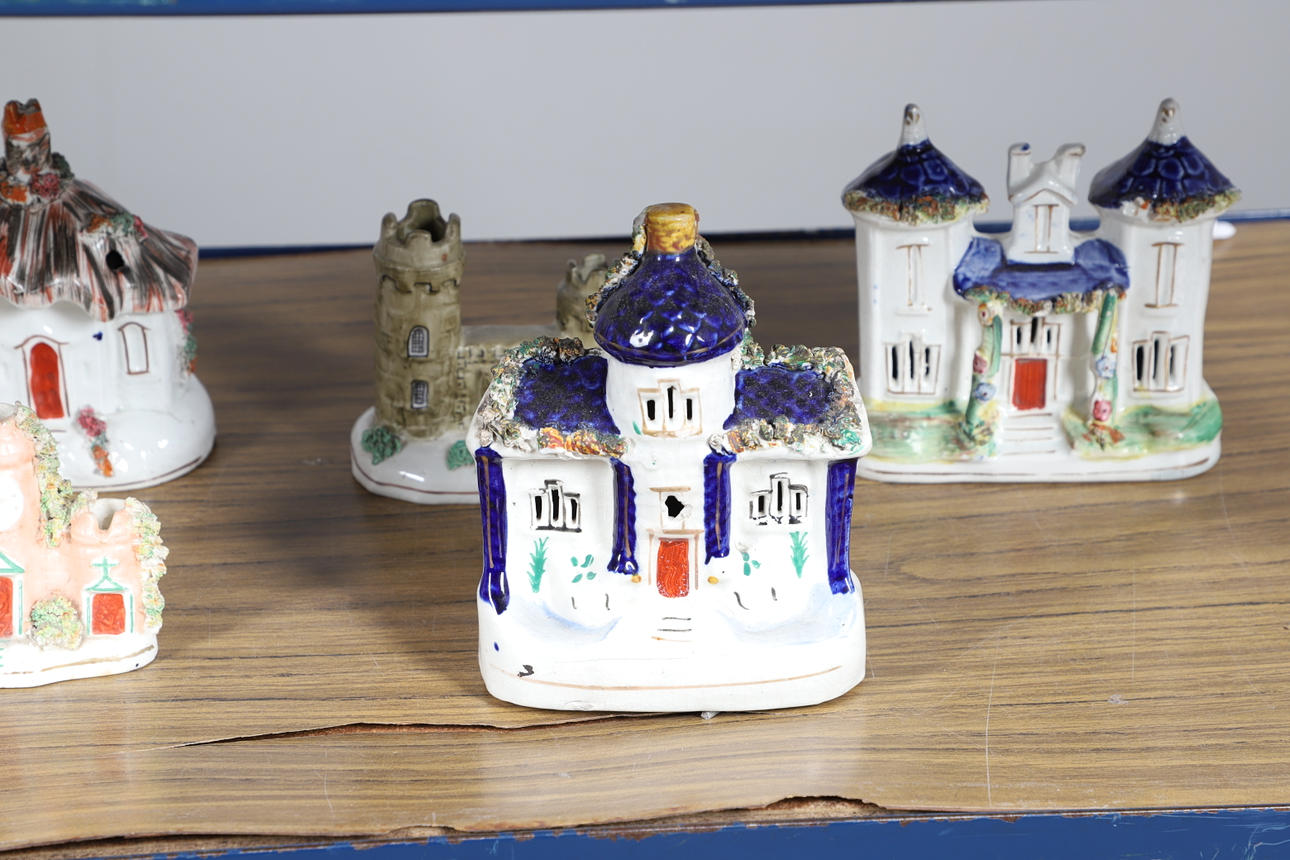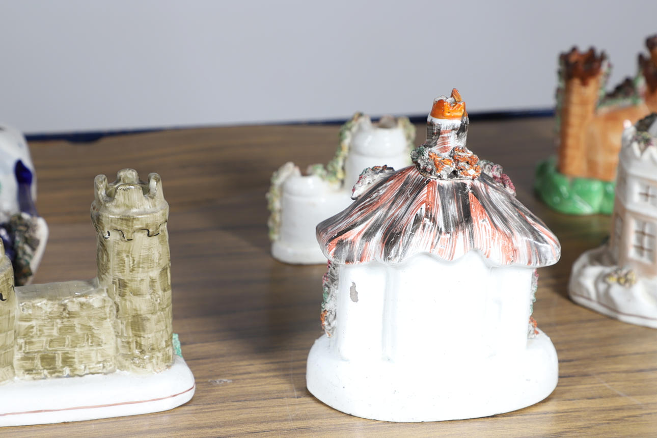 A variety of 19thc Staffordshire cottages and buildings, including a Church (23cms high), a castle watch holder (19cms high), and various other examples.