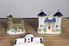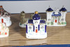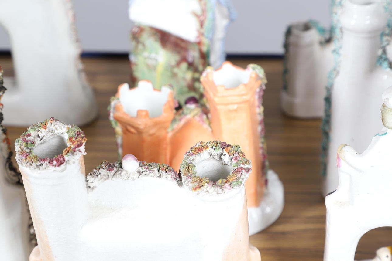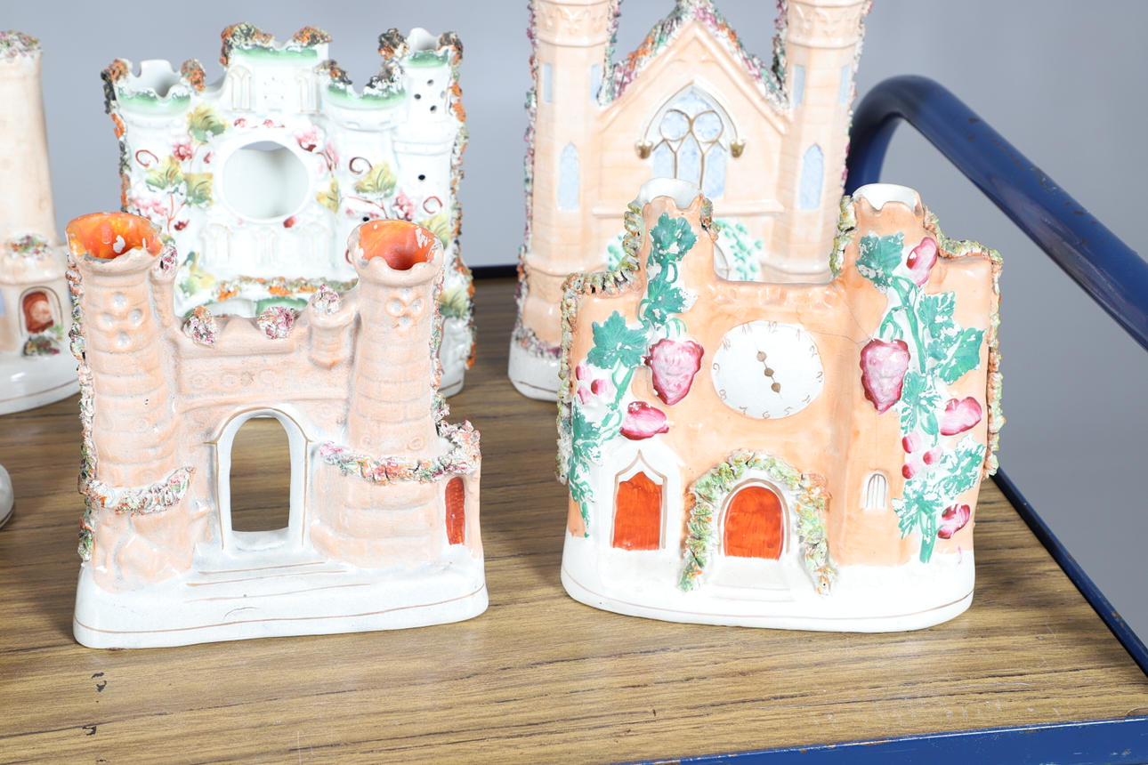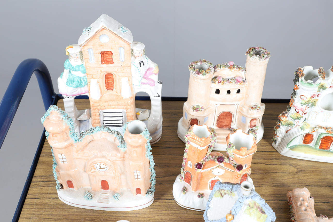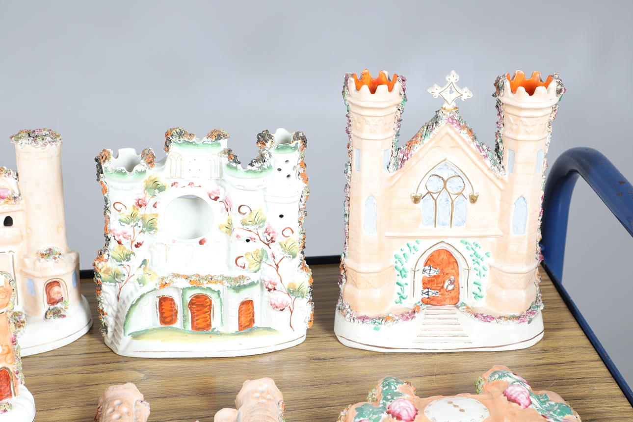 A variety of 19thc Staffordshire cottages and buildings, including a Church (23cms high), a castle watch holder (19cms high), and various other examples.