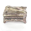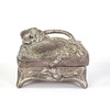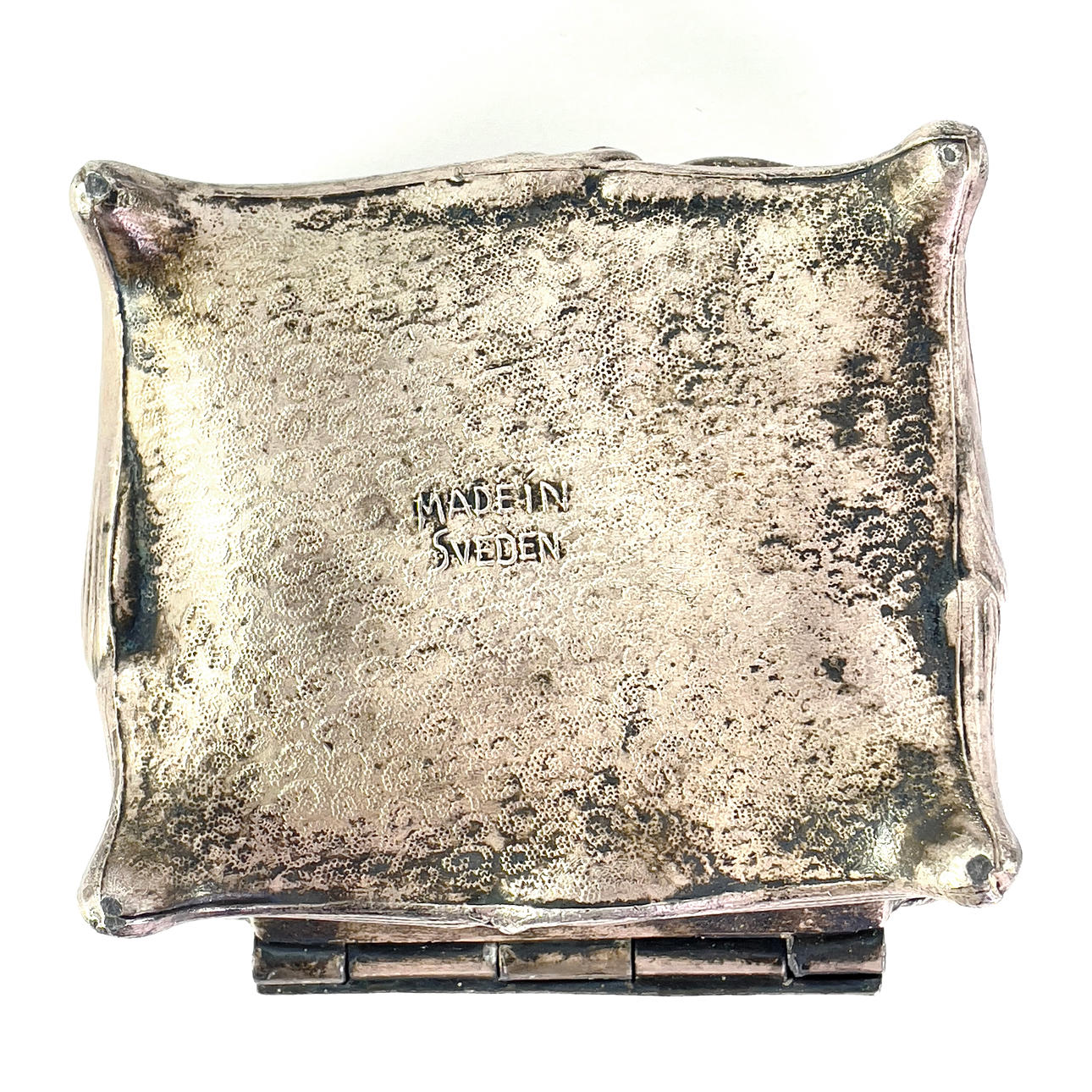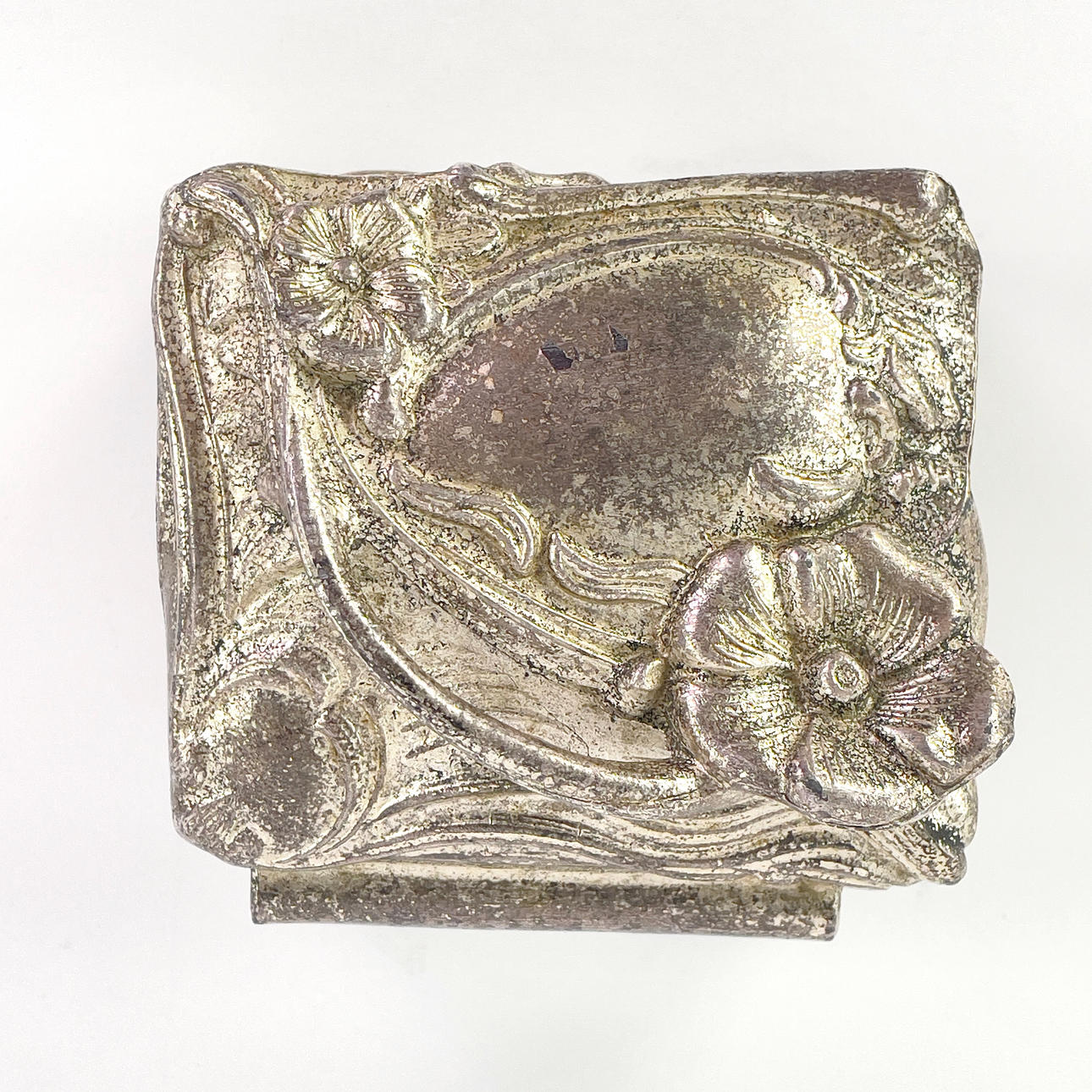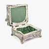 Box with cover, decor of flowers, interior with textile. Length about 8 cm, width about 7.5 cm, height about 5 cm.