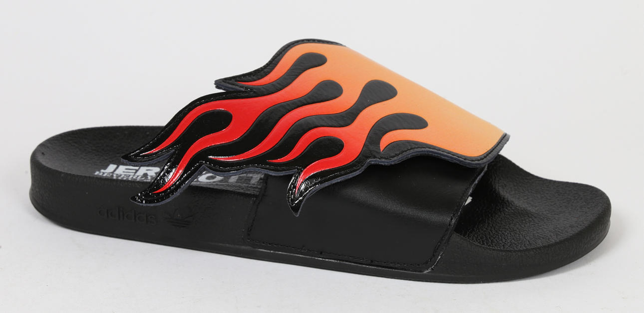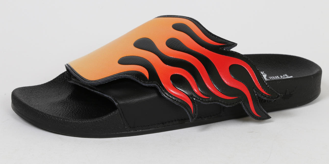 With flame fold over straps, black footbed.