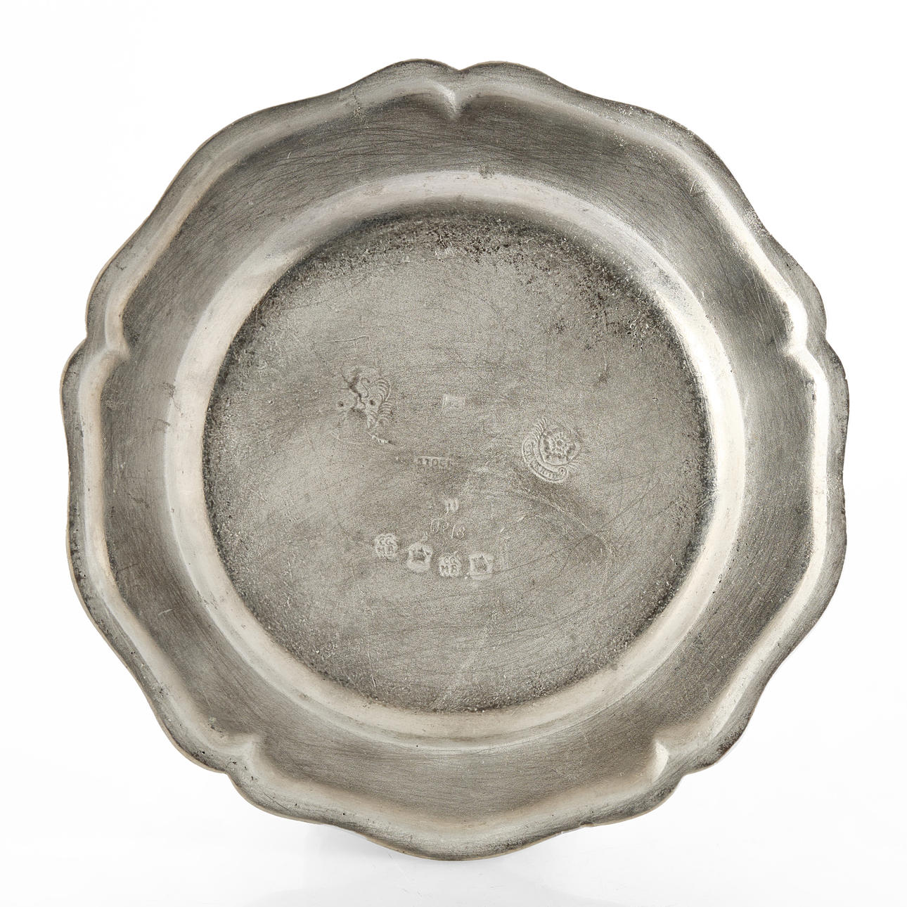 4252023. PLATES, 9 pcs, pewter, marked Orrklou, rococo style.