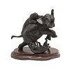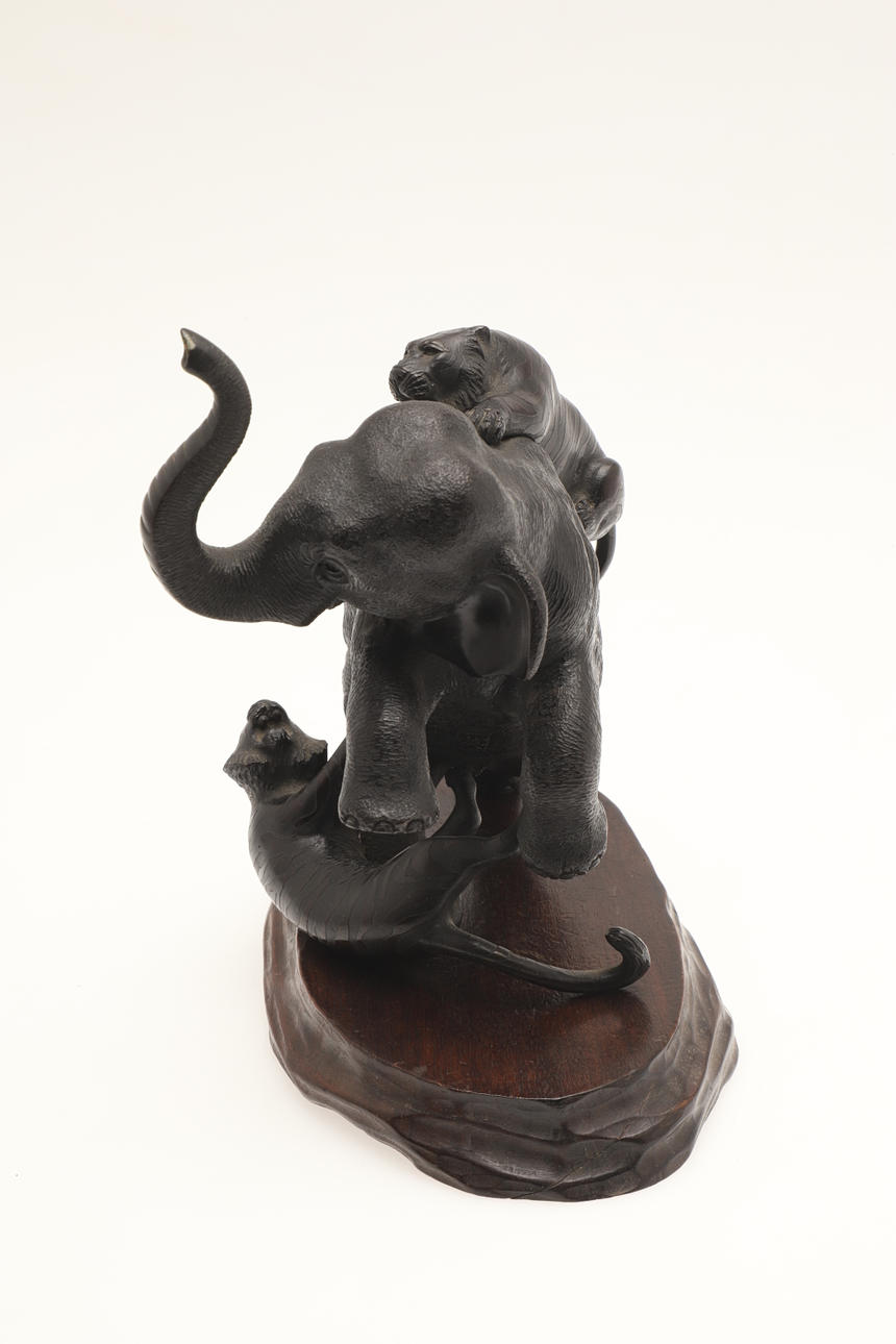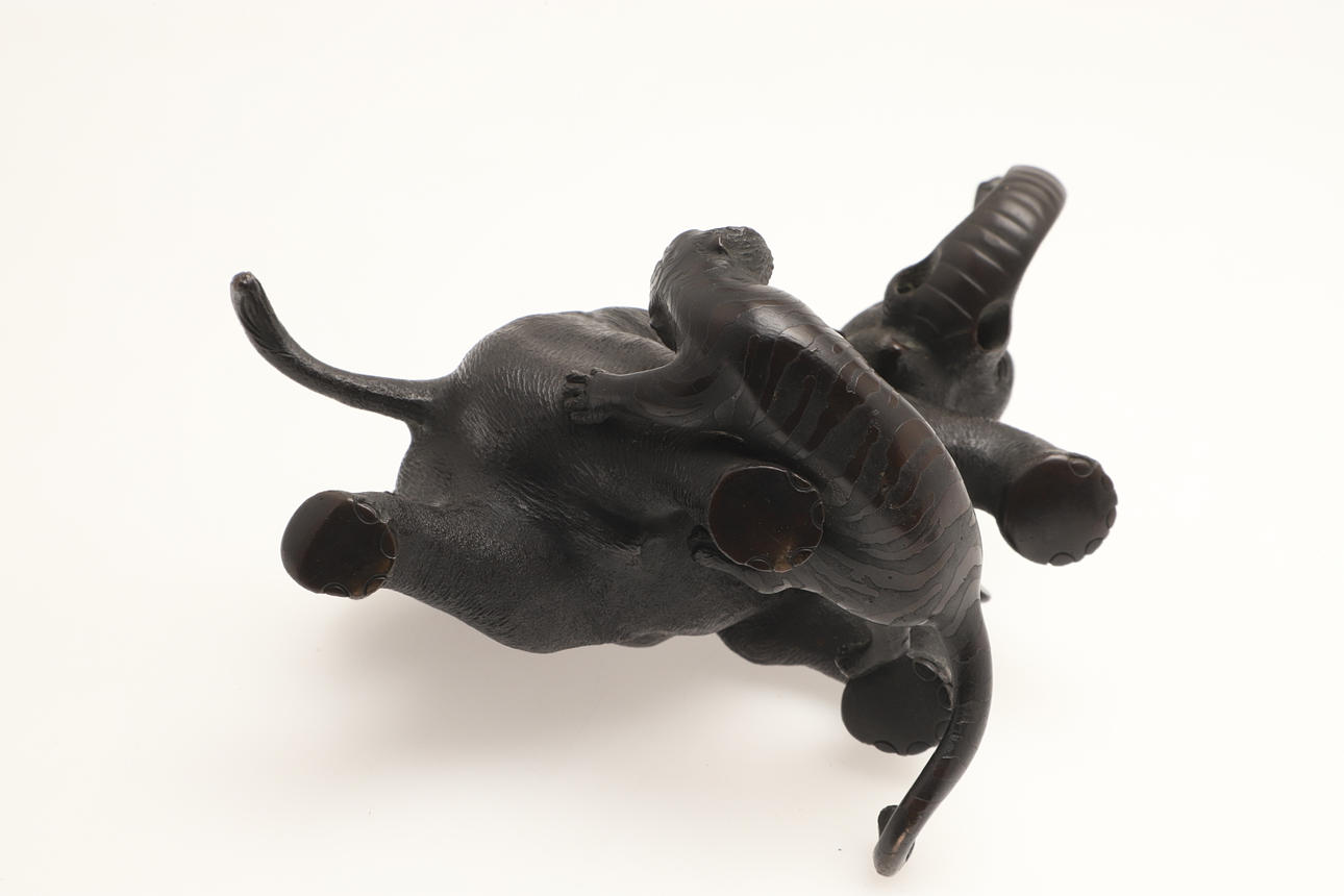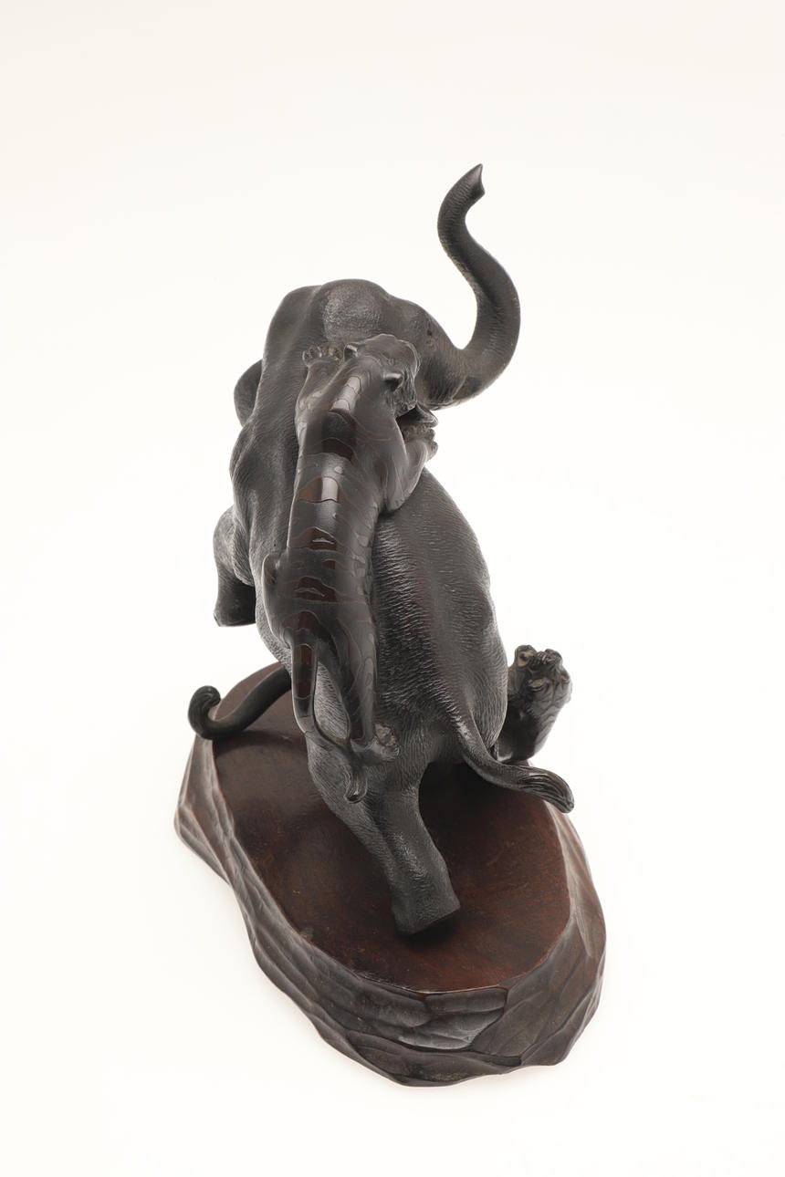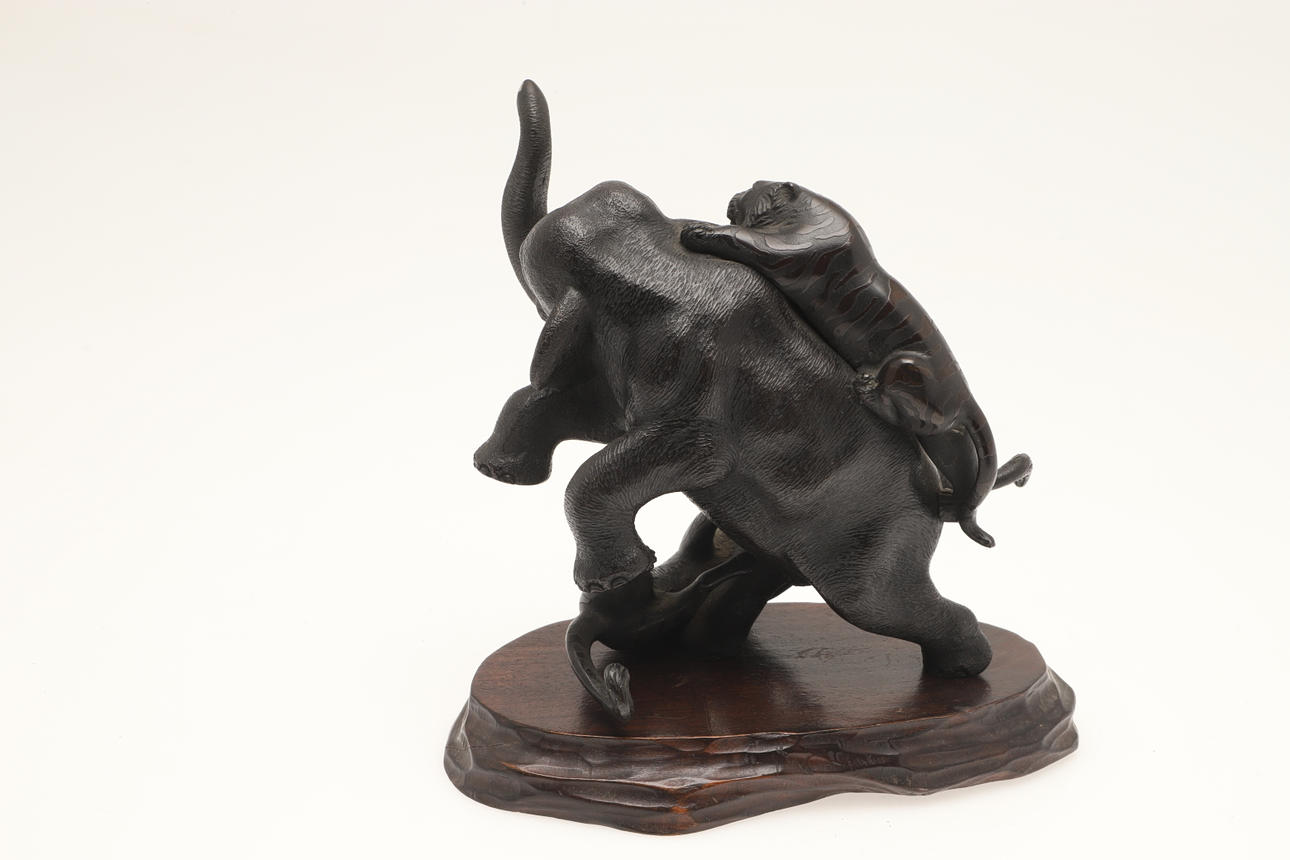 A bronze sculpture of two Tigers attacking a Tiger, with character marks to the underside and with a wooden stand. 15cms high.