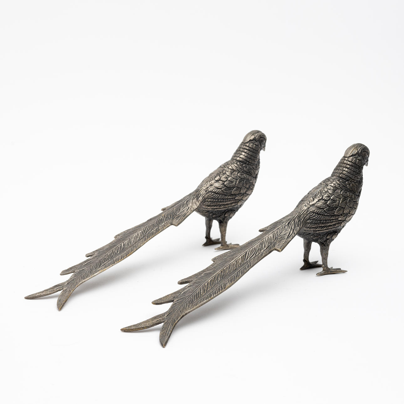 A pair of light metal table decorations, Peacocks.