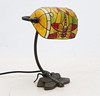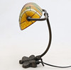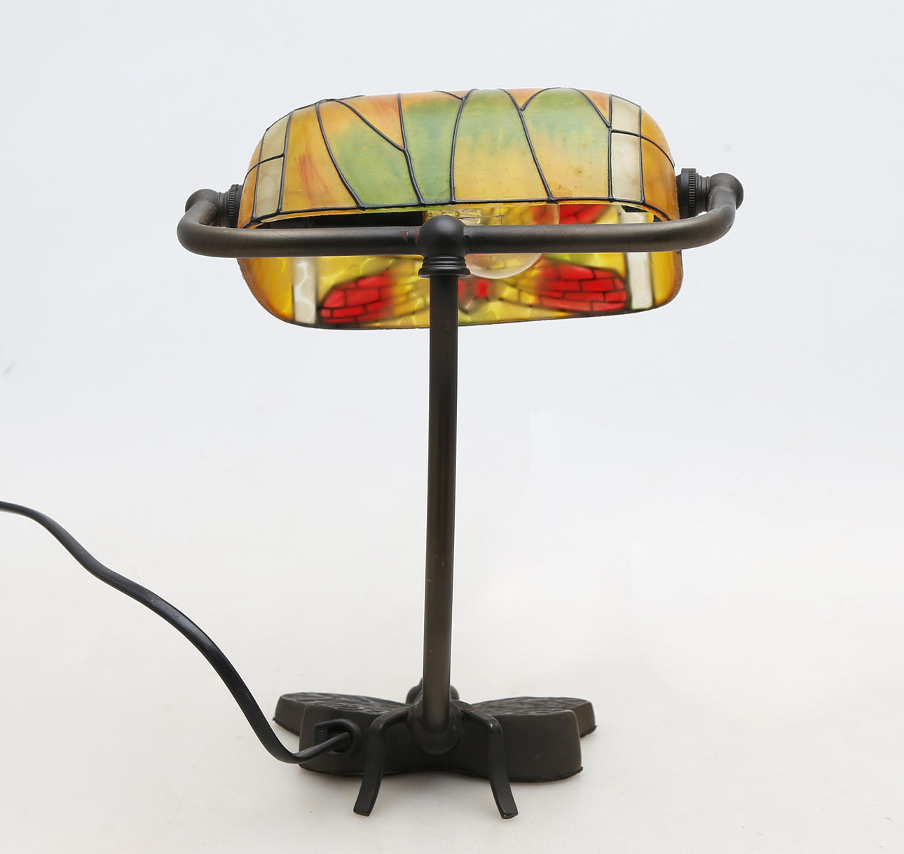 Polychrome glass with black enamel simulating stained glass. With metal base in the shape of a dragonfly.