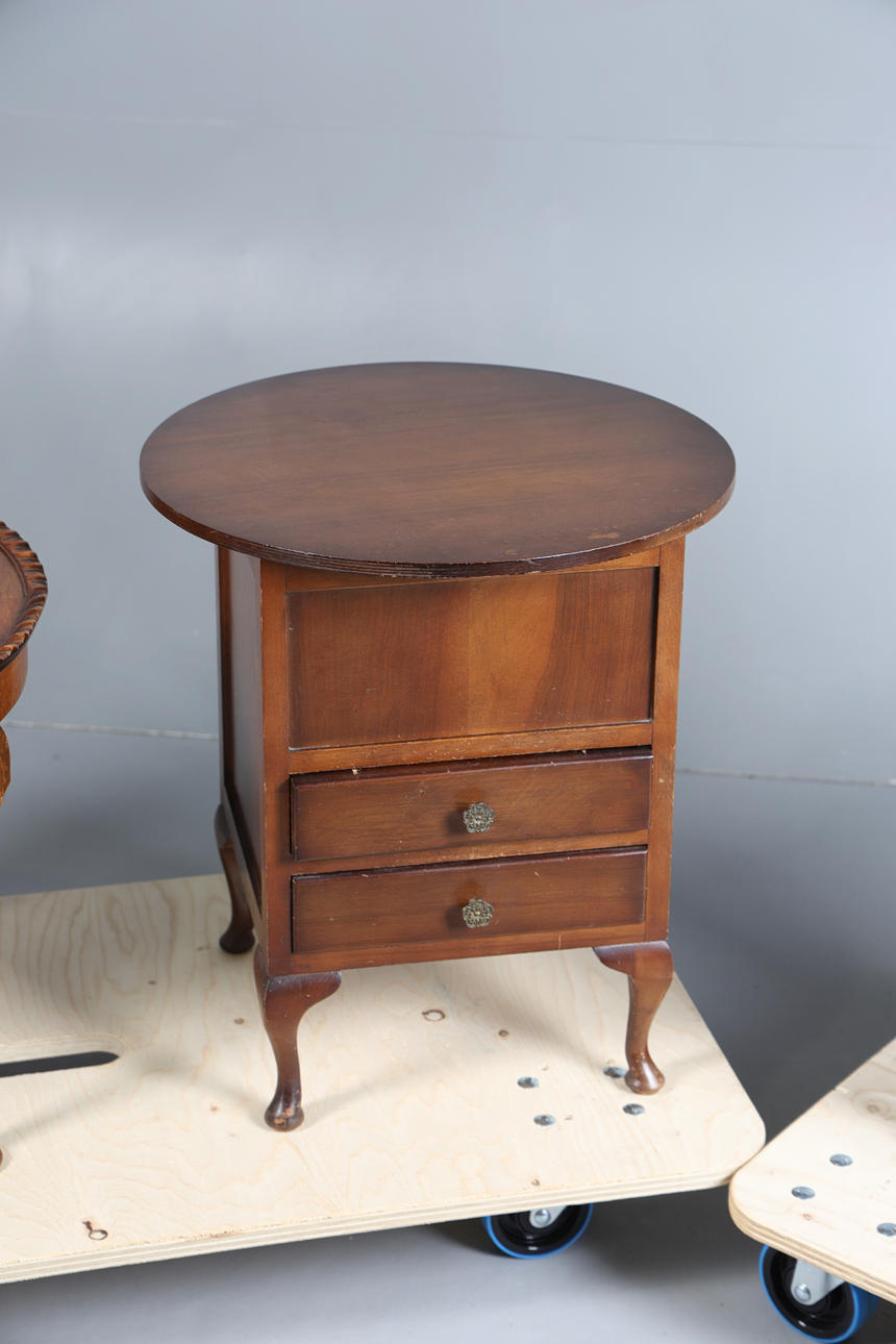 Three pieces of 20th Century walnut furniture to include a glazed display cabinet (106cm height), a two drawer sewing box (50cm diameter) and a quarter veneered coffee table with gadrooned top (61cm diameter). (3).