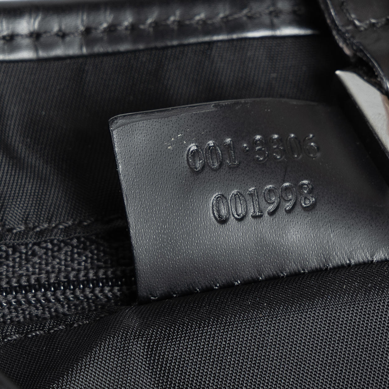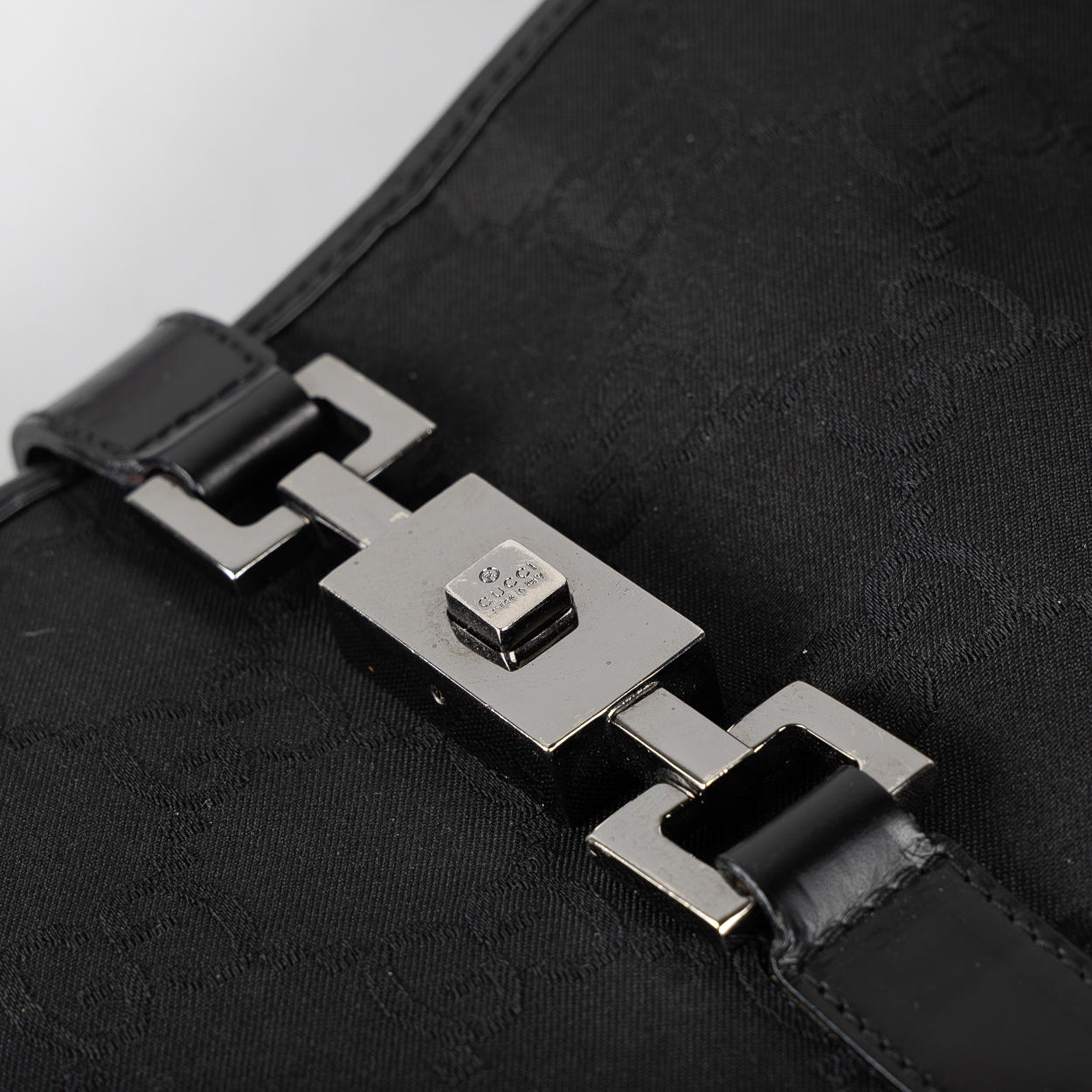 Bag in black GG monogram woven fabric with details in black leather. Metal gun lock. An inner compartment with a zipper. Branded® GUCCI, made in italy. Number 001-3306 001998. Dustbag included. Shoulder strap drop about 19 cm. Bag approx. 33 x 22 x 3 cm.