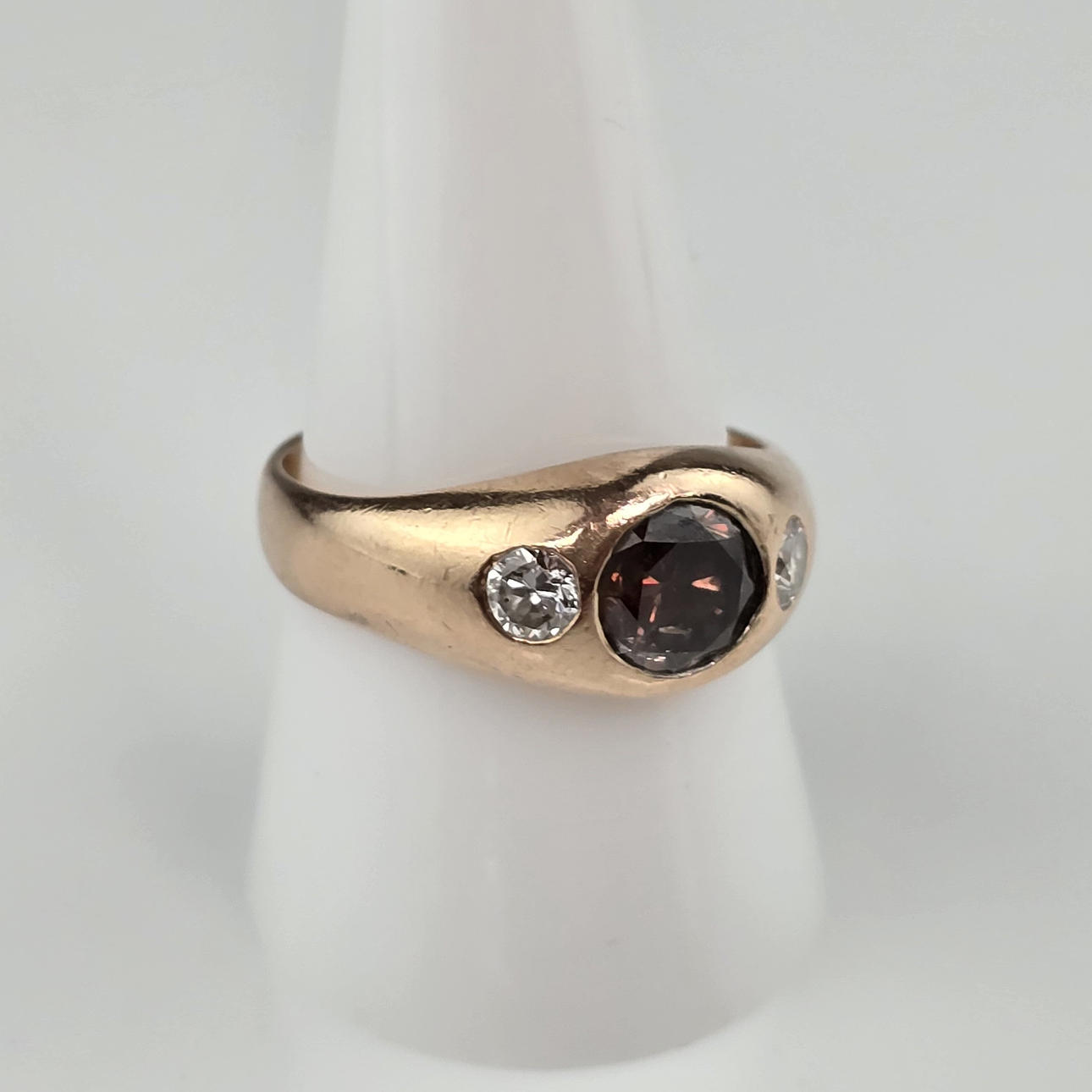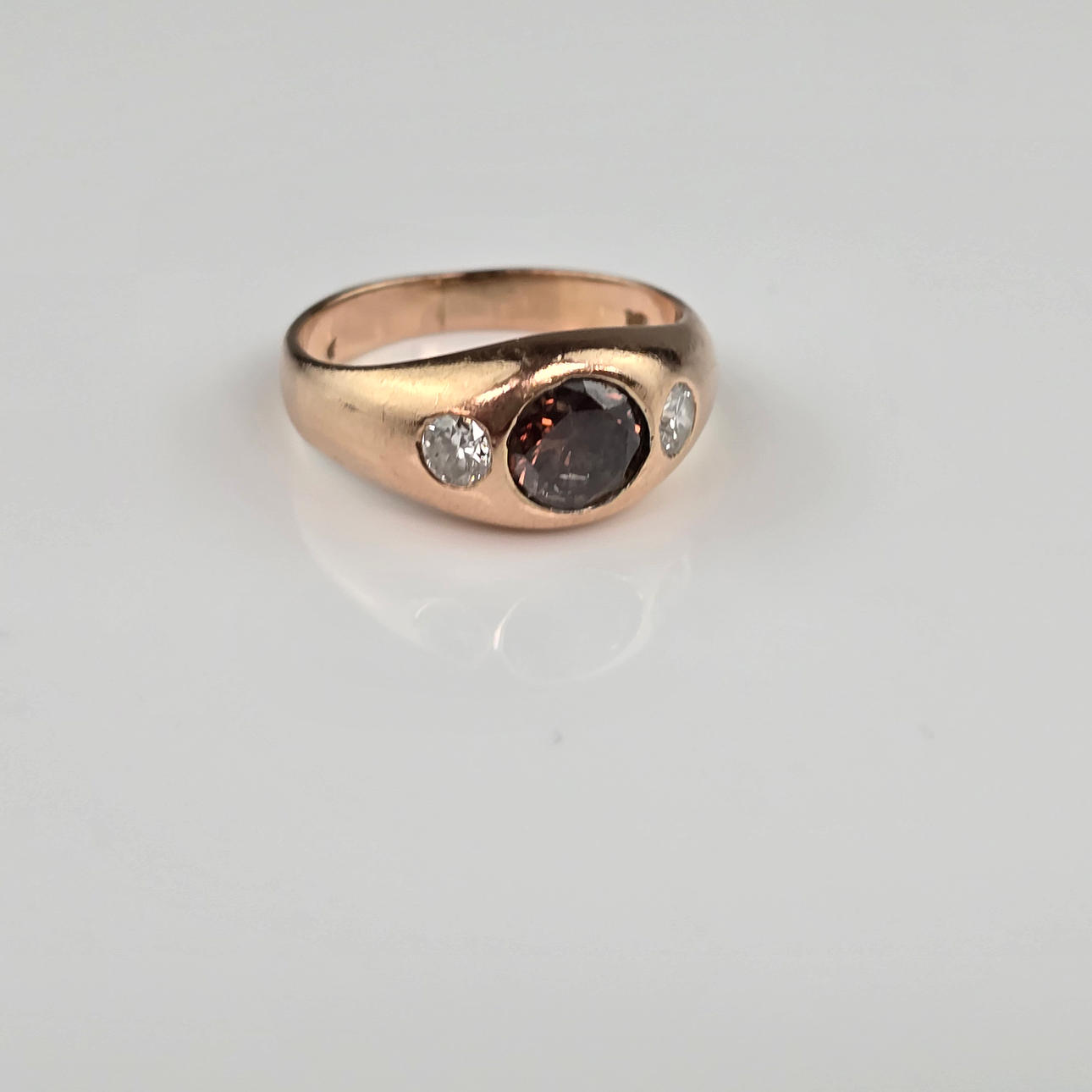 hallmarked, centrally set with 1 brilliant-cut coloured diamond of 1.25 carats. (natural color: cognac fine/purity: P2) flanked by 1 faceted old-cut diamond totalling 0.40 carats. (color: G (Top Wesselton)/Clarity: Vs), ring head width 9.5 mm, weight 7.8 g, ring size 63, attached expert report December 1997.