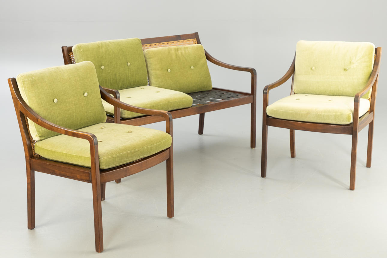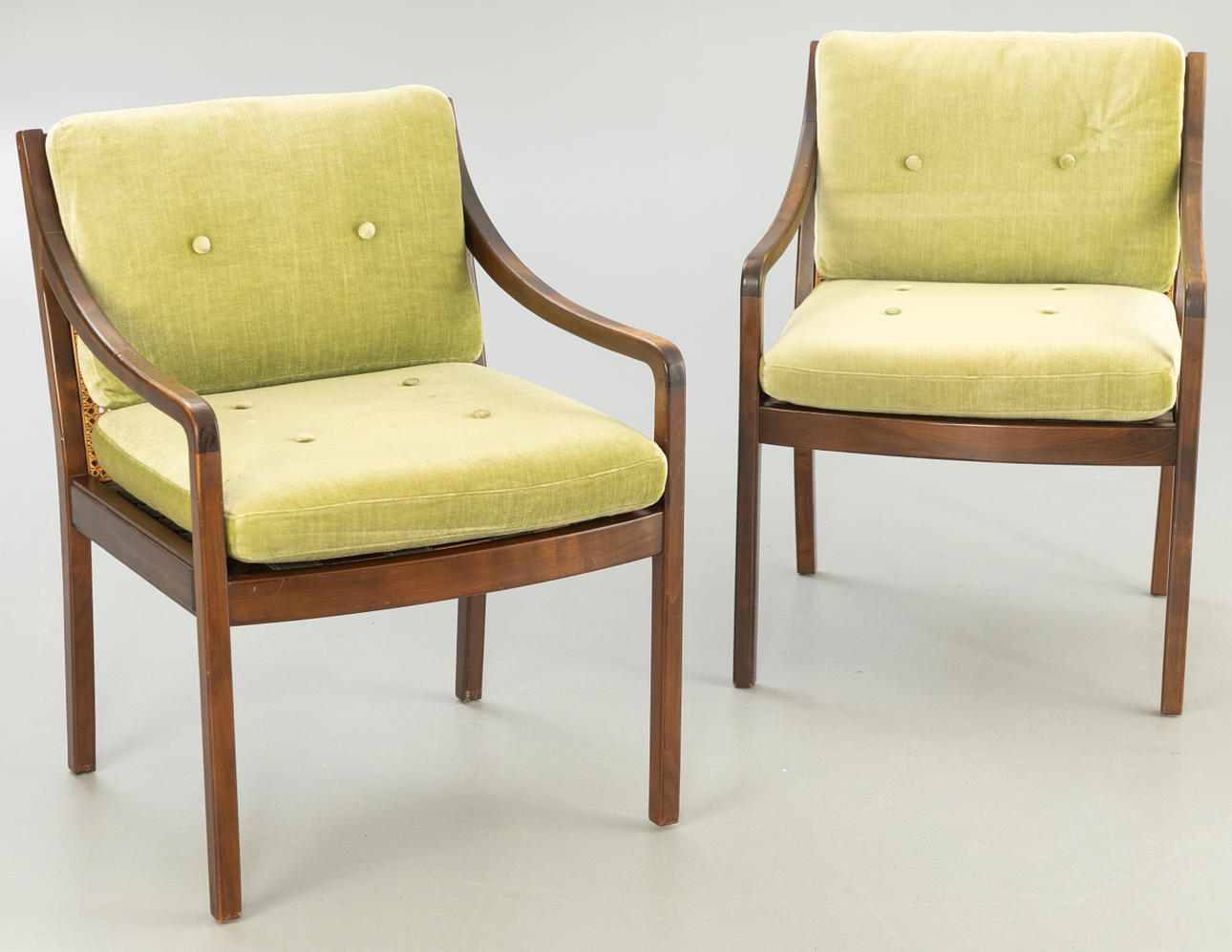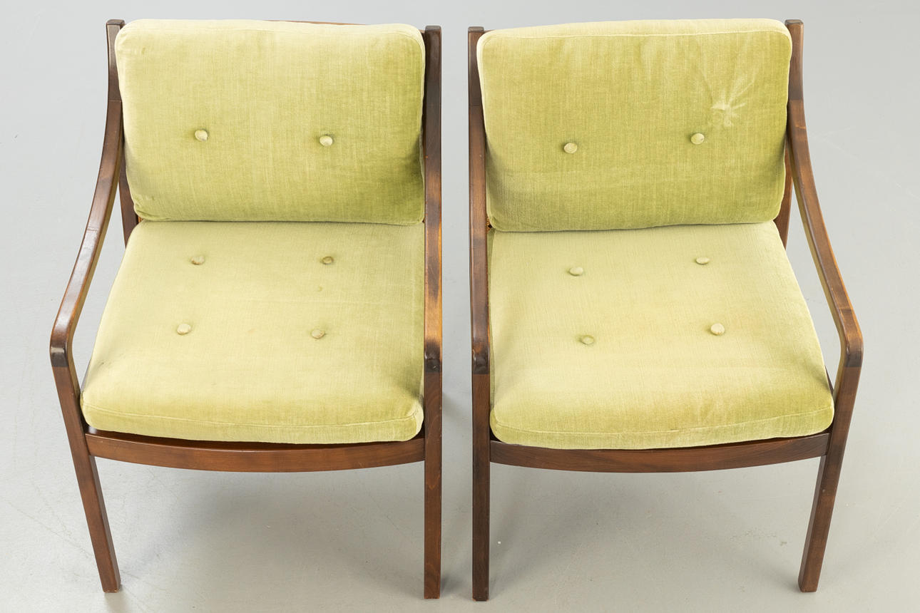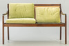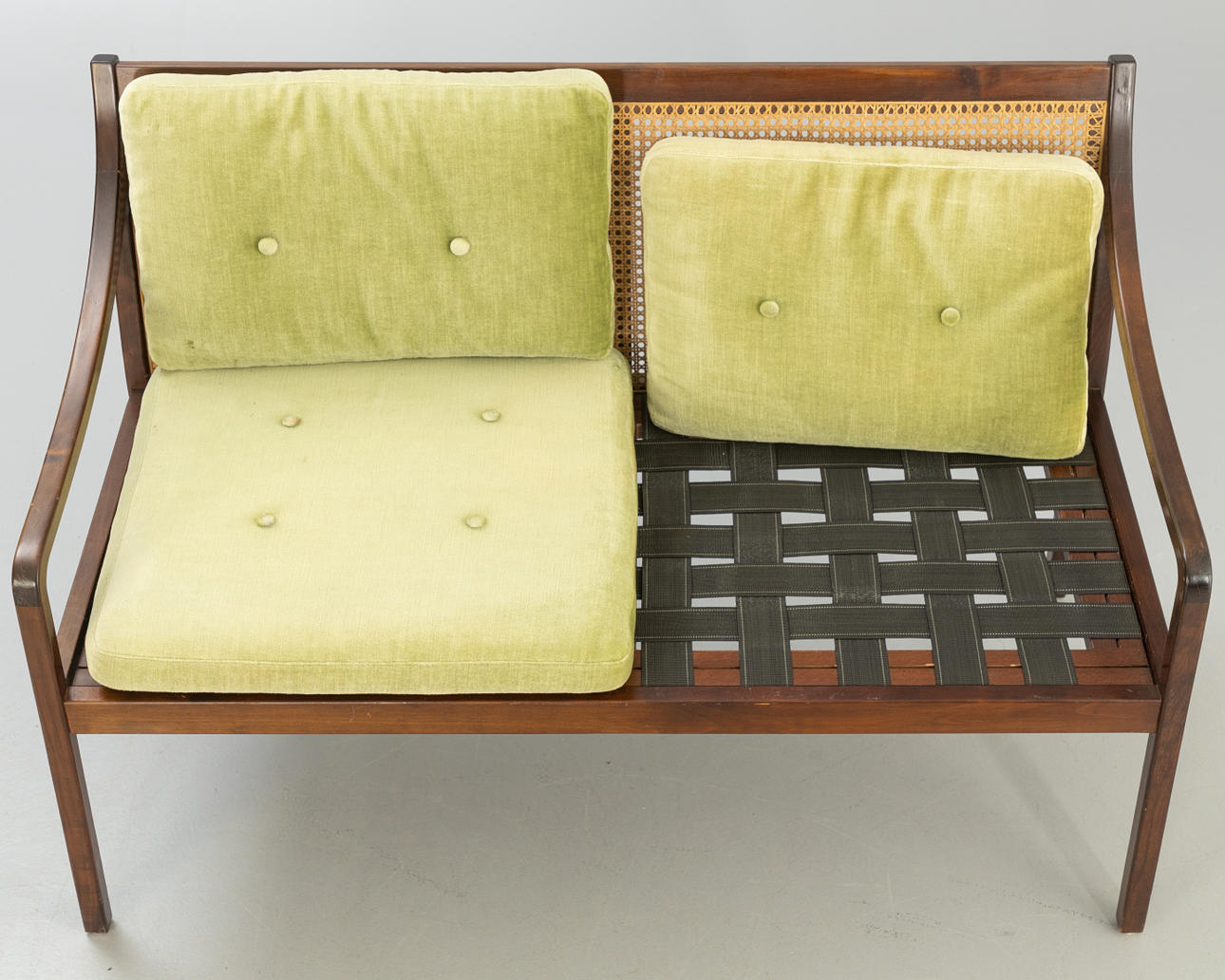 Wood, dark stained. Tubular mesh backrest. Loose seat cushions with light green velour fabric.