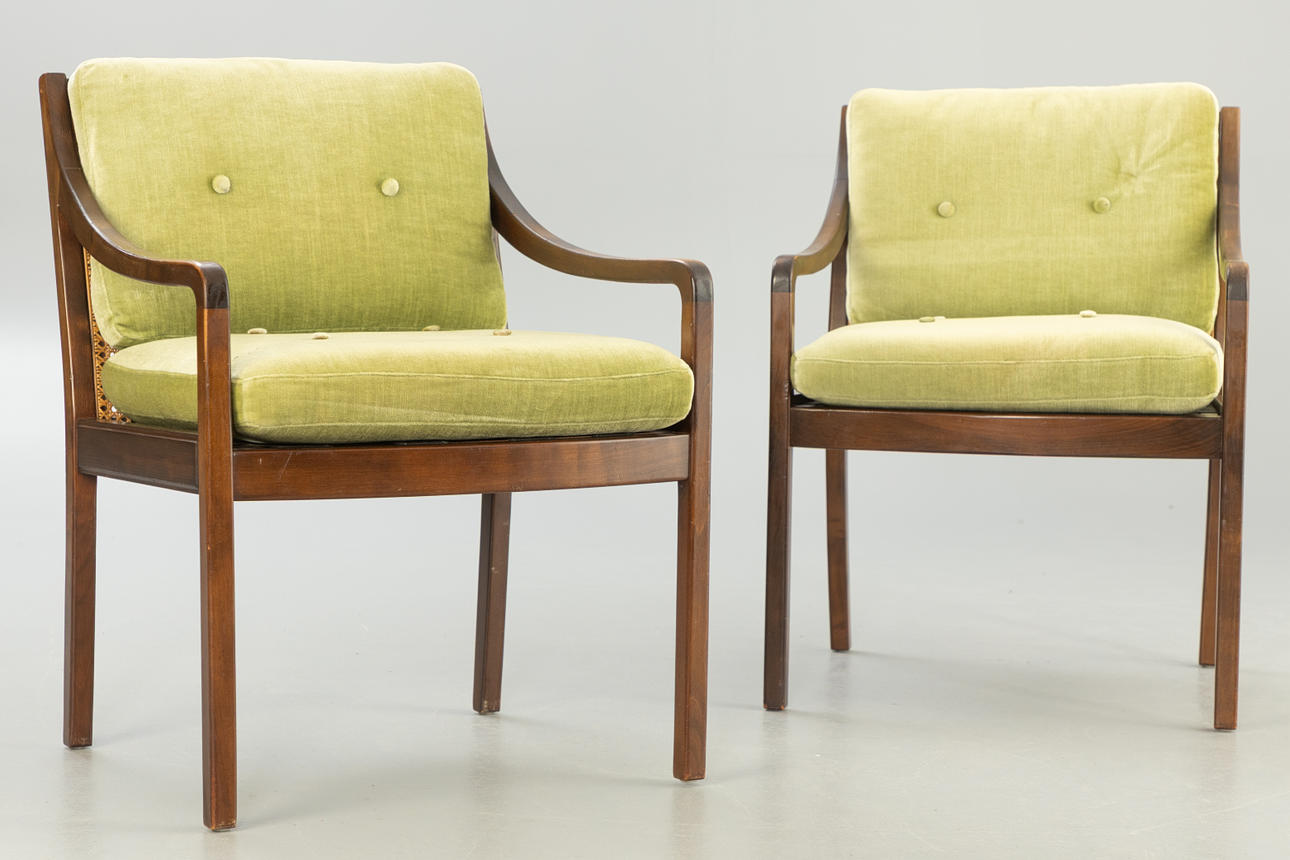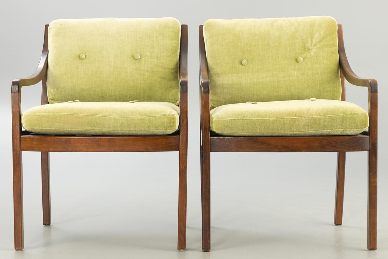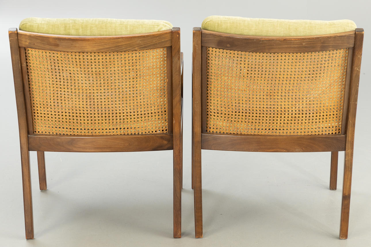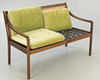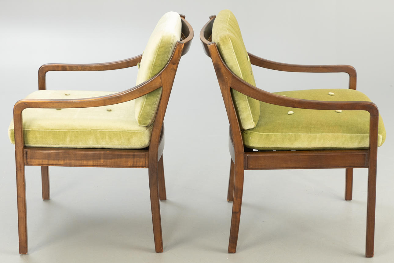 Wood, dark stained. Tubular mesh backrest. Loose seat cushions with light green velour fabric.