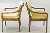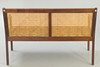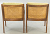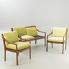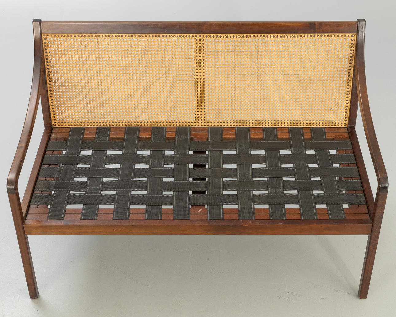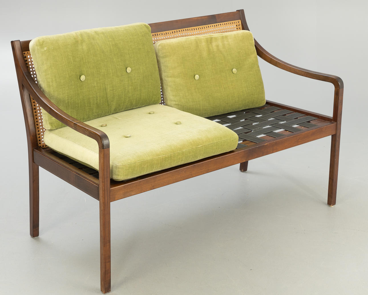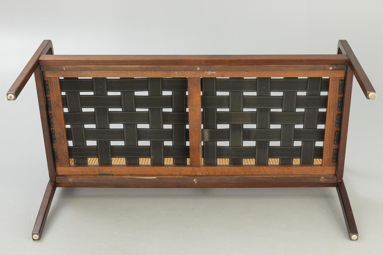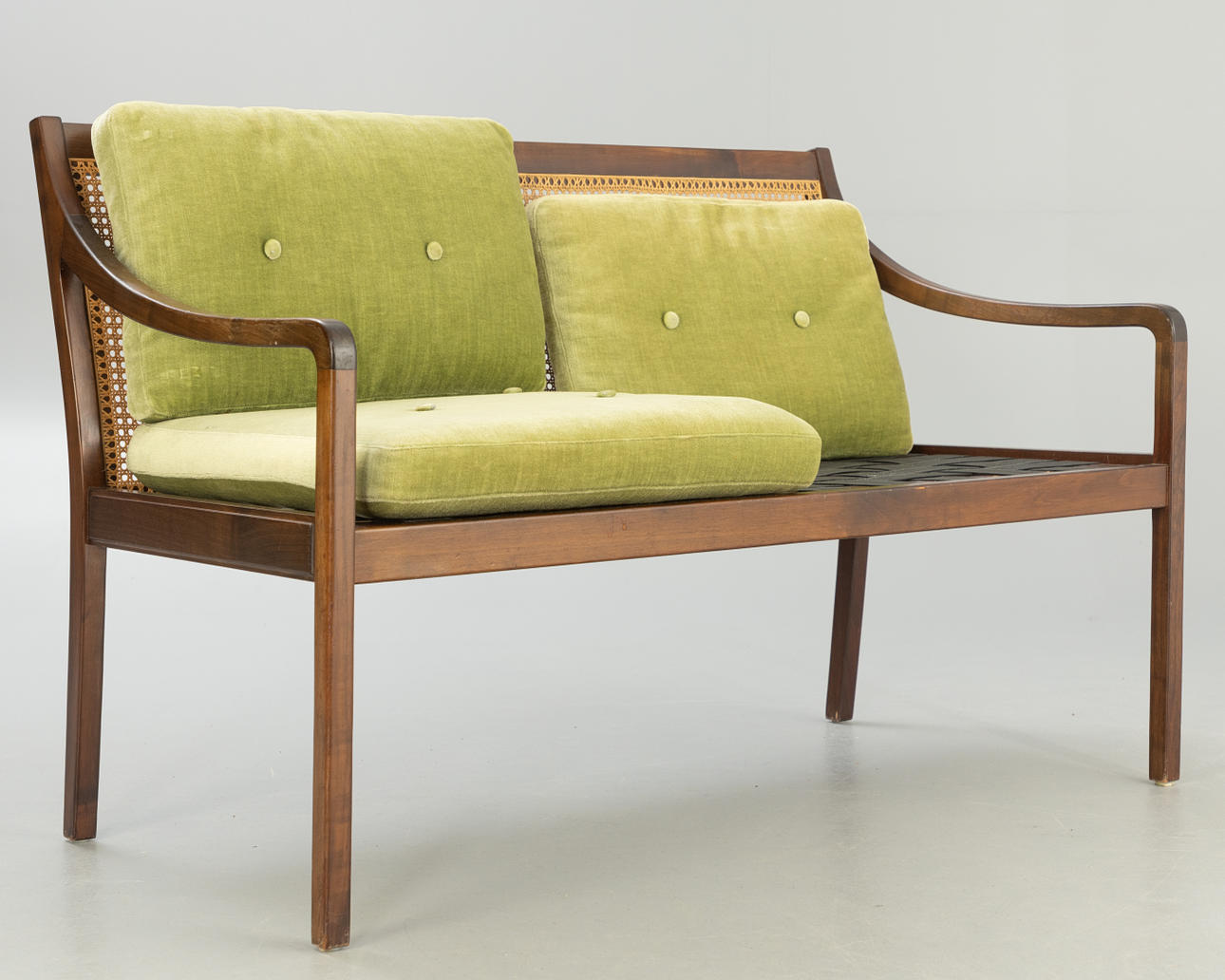 Wood, dark stained. Tubular mesh backrest. Loose seat cushions with light green velour fabric.