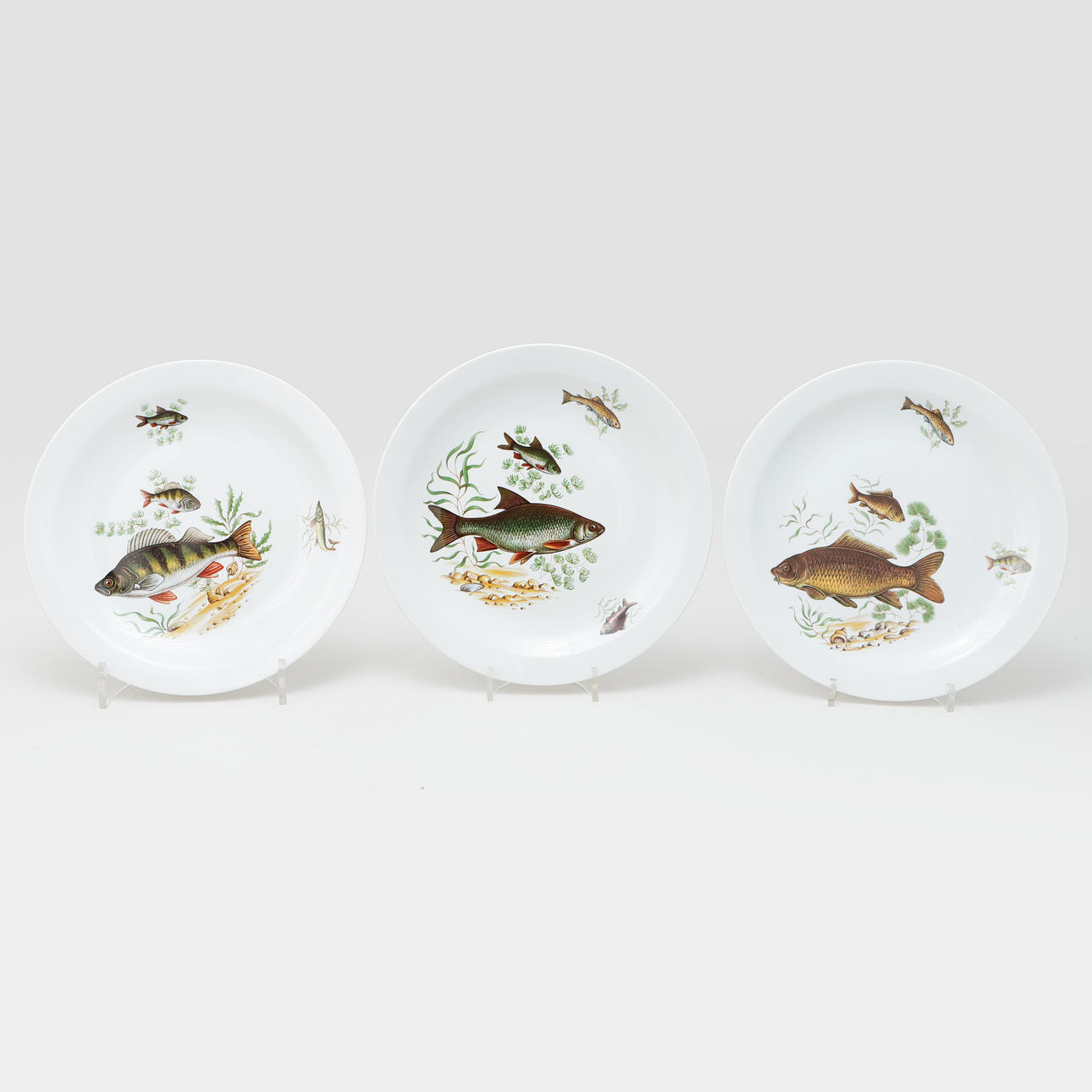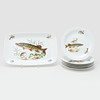 6 plates and serving dish, diameter 24,5 cm, saucer 40 x 24,5 cm.
