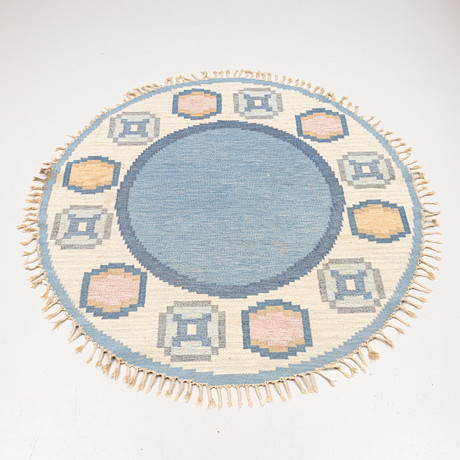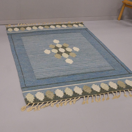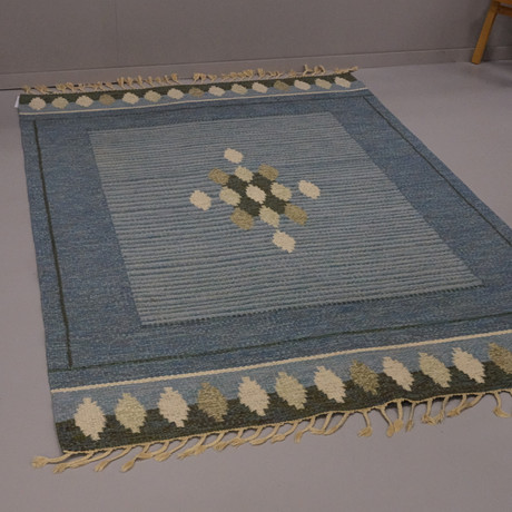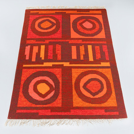 Monogram signed, with geometric decor in blue, pink and white, 275x186 cm.