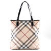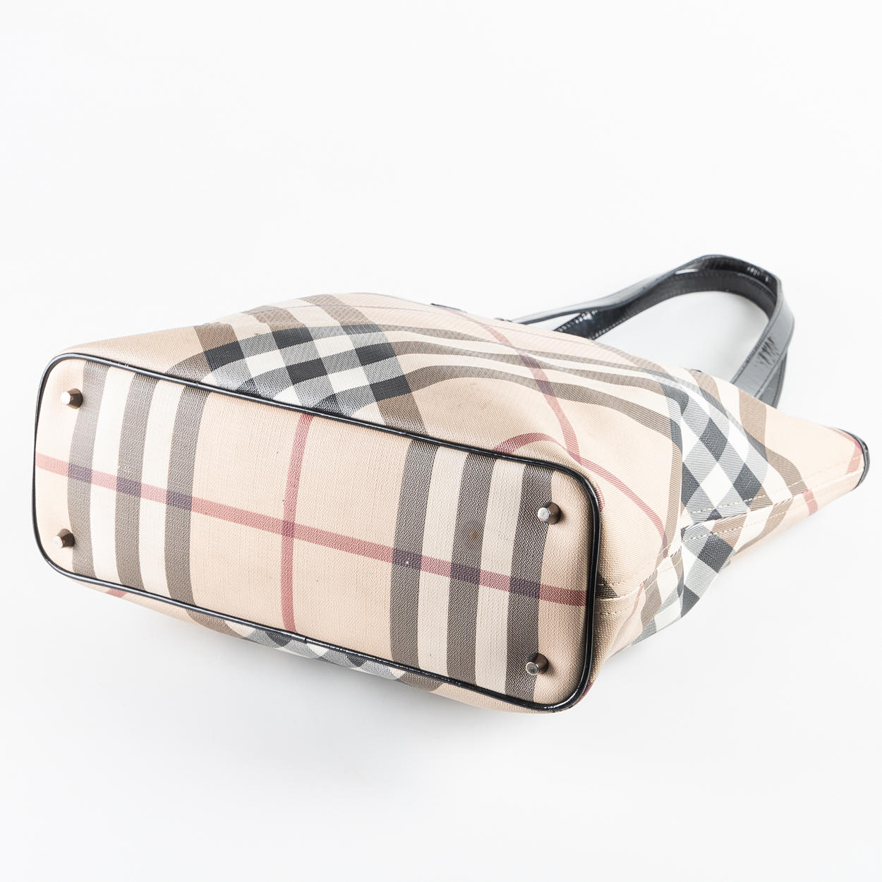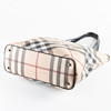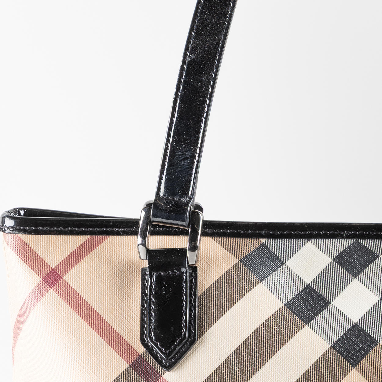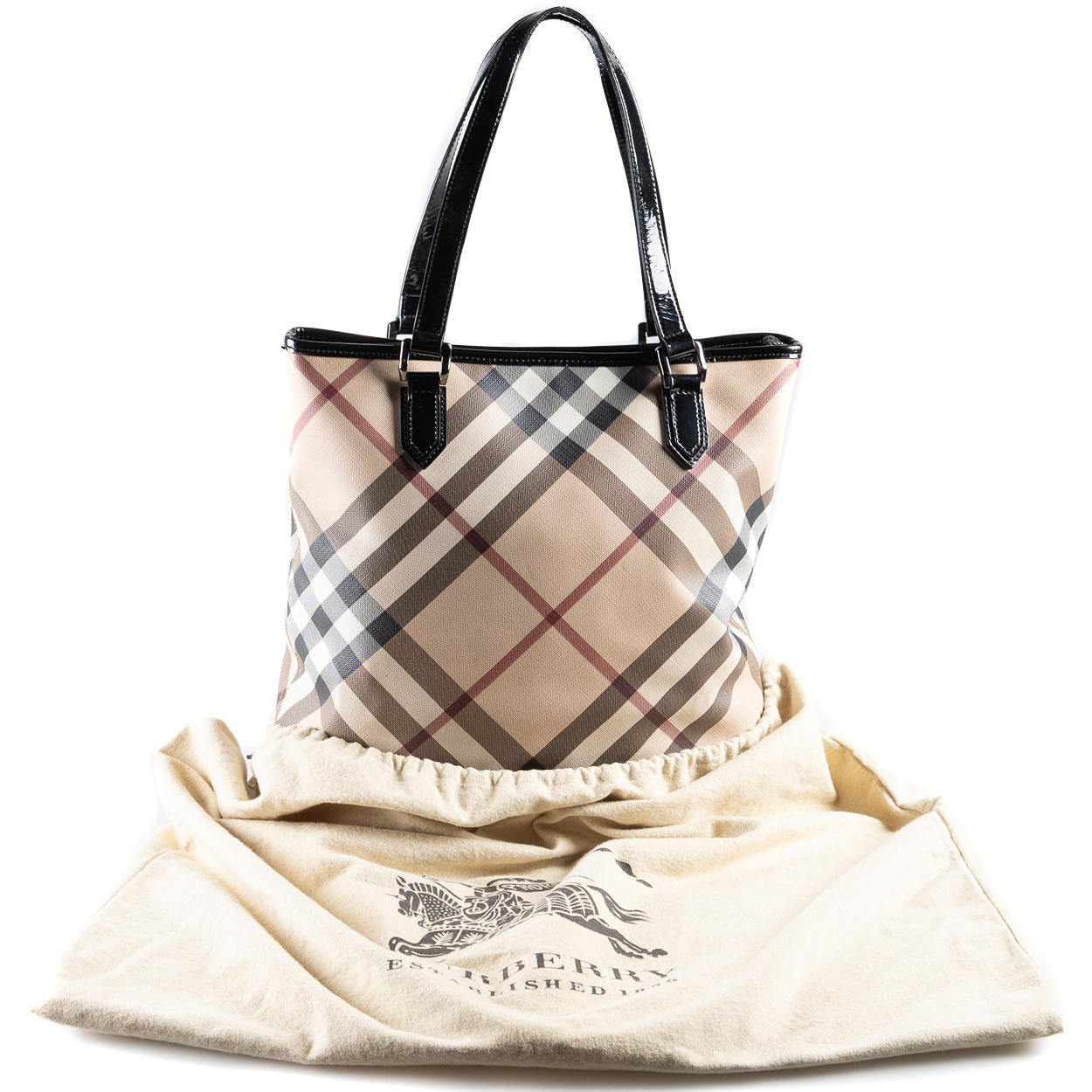 with handles and edging in varnished leather, hardware in white metal. Interior with beige lining fabric, a zippered side compartment and two open side compartments. Tagged BURBERRY. Dustbag included. Approx. 33x33x12 cm. Handle drop about 20 cm.