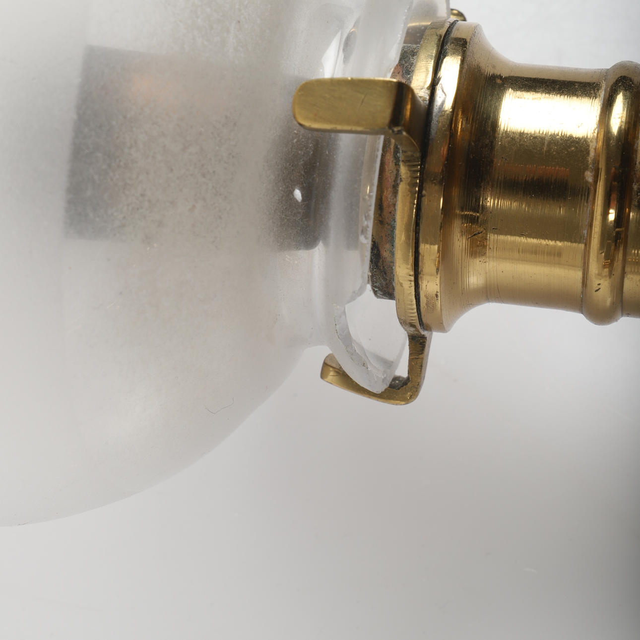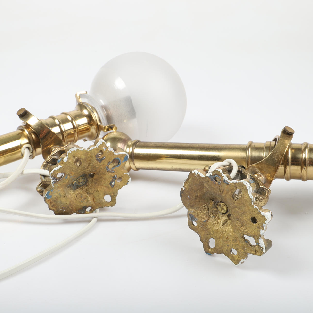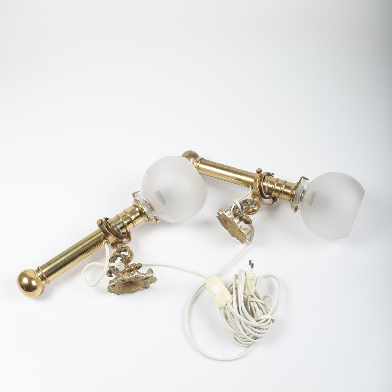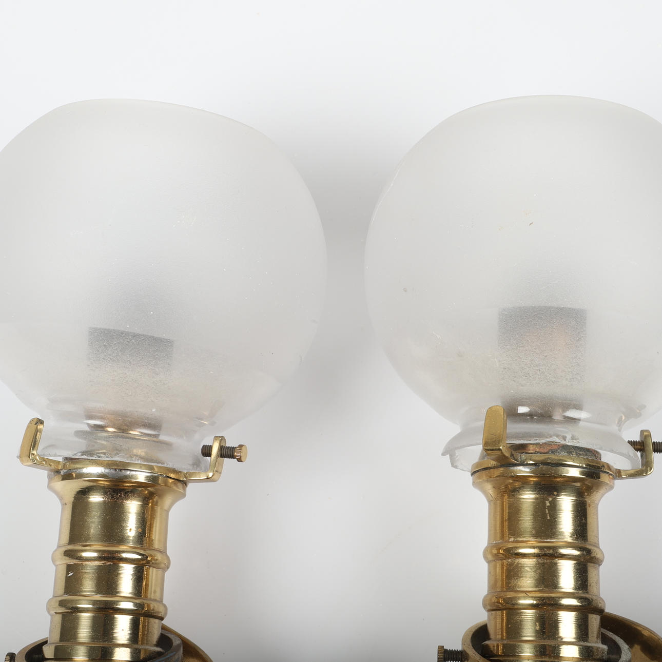 Normal wear and tear with marks and stains and bottom-notched glass cups, cords tied in the wall brackets.