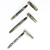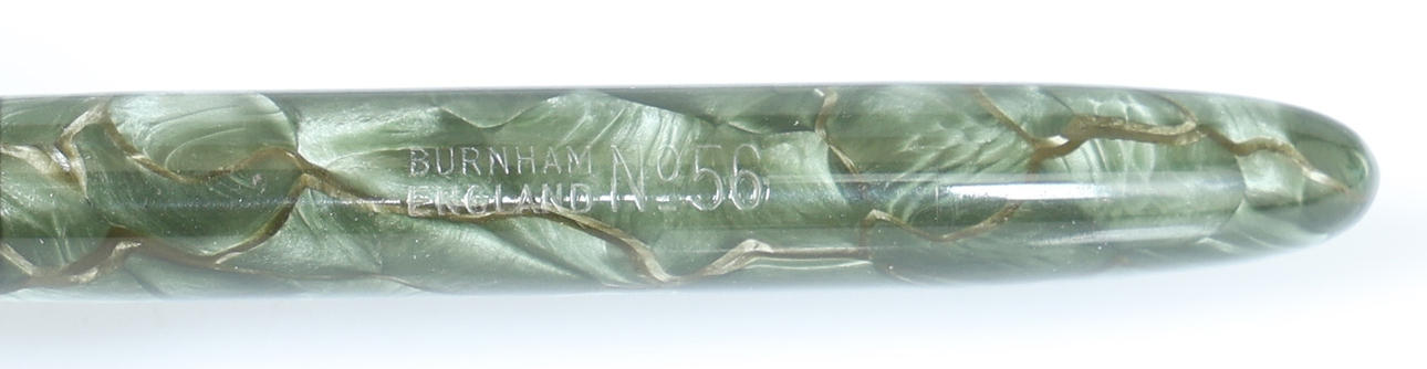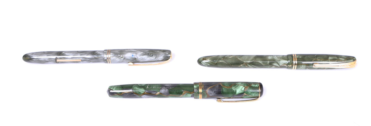 The first a Circa 1950's No.47, with green and brown marble effect barrel with gold filled trim, imprinted 'Burnham No.47 England', with 14ct gold nib reading 'Burnham Fine S20', 11.5cm, the second No.54, with light/dark grey marble effect barrel, imprinted 'Burnham, England, No.54', 14ct gold nib, 11.5cm long, the third No.56, with dark/light green marble effect barrel, imprinted 'Burnham England No.56', 14ct gold nib, 12cm long (3).