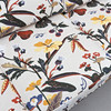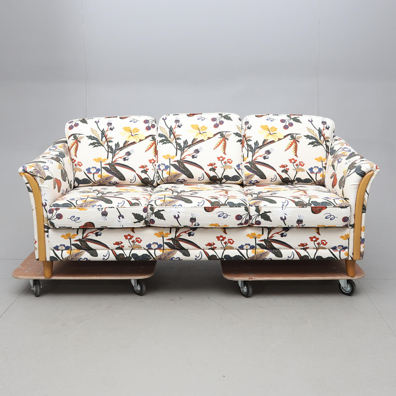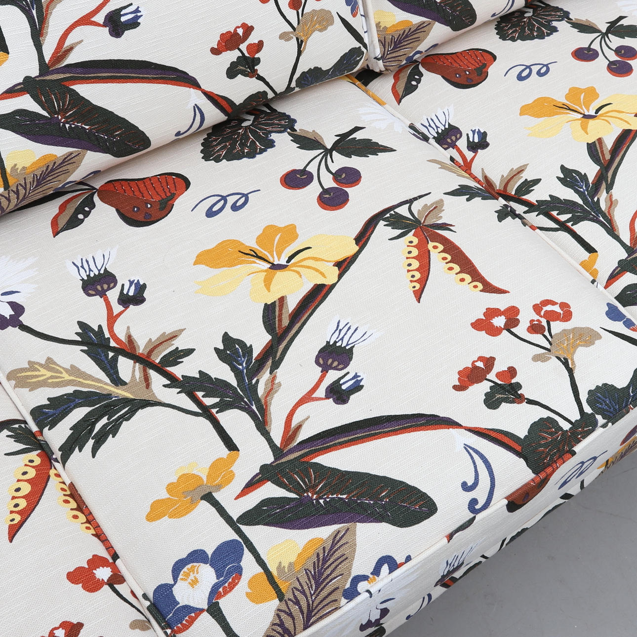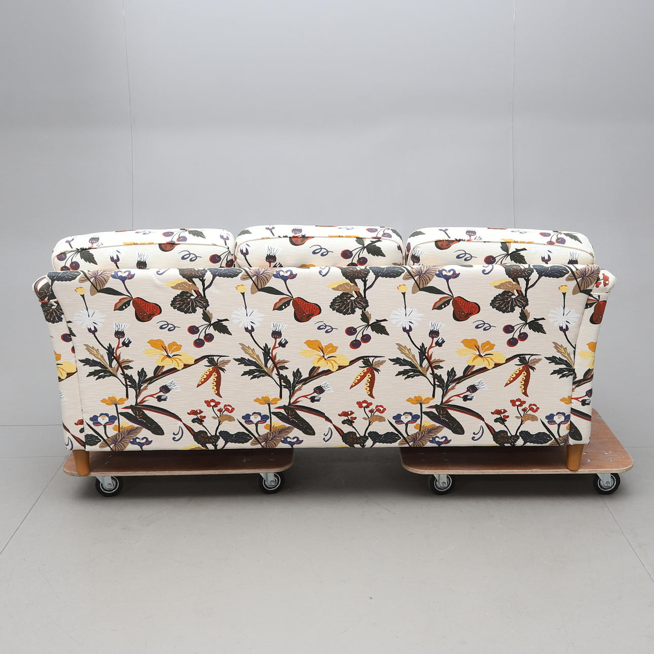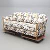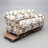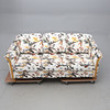 Textile. Loose cushions in the back and seat. Length ca 185, width 80, height 80 cm.