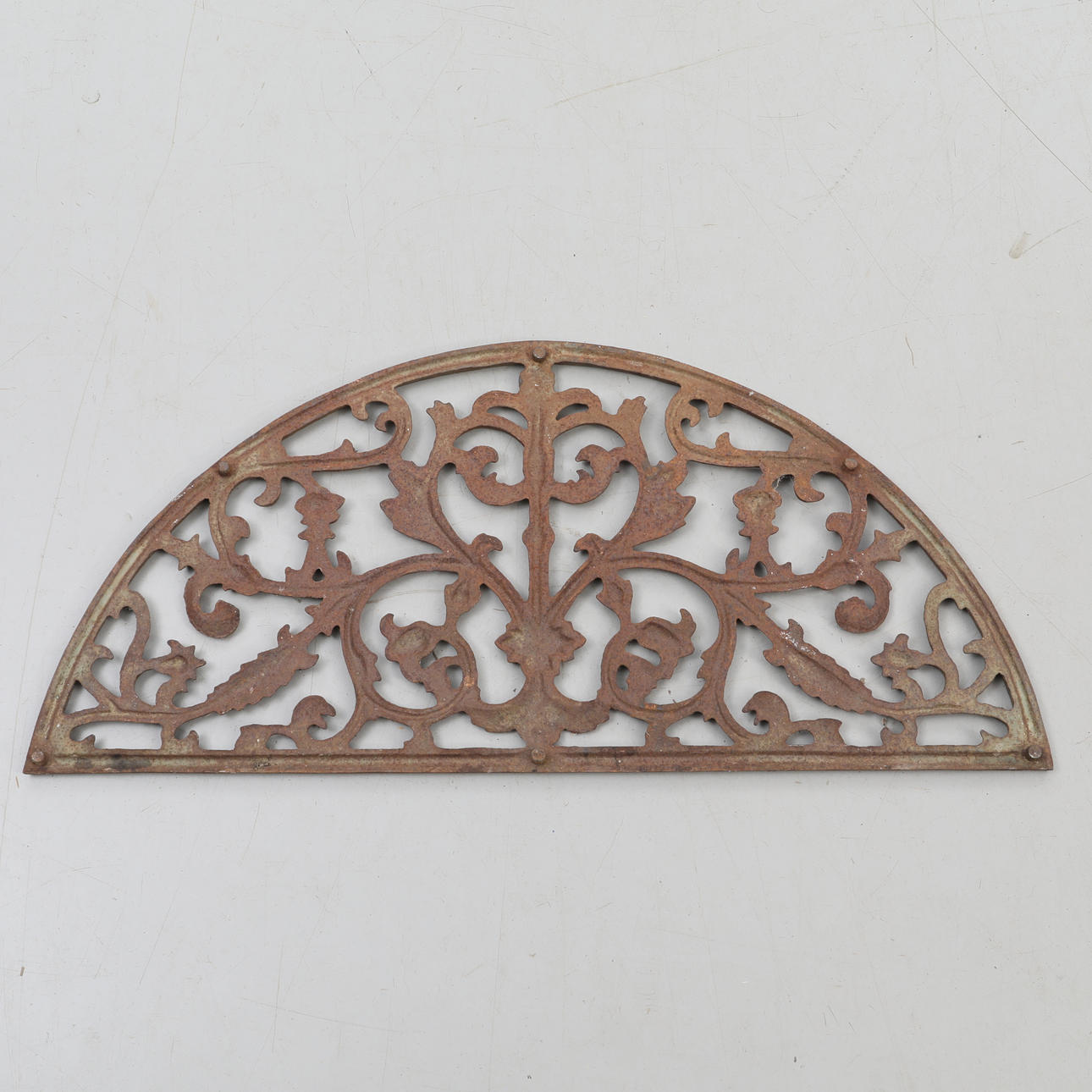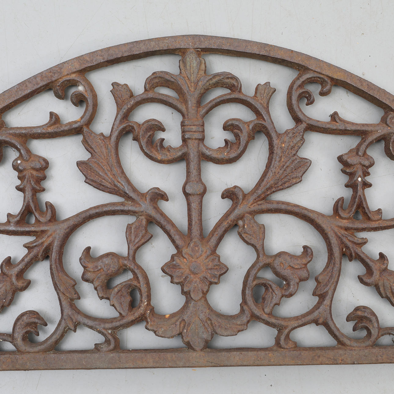 Crescent shaped foot scraper/door mat in cast iron, with a neat pattern.