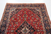 Handknotted carpet in wool on cotton warp, lenticular medallion on over-patterned red base.