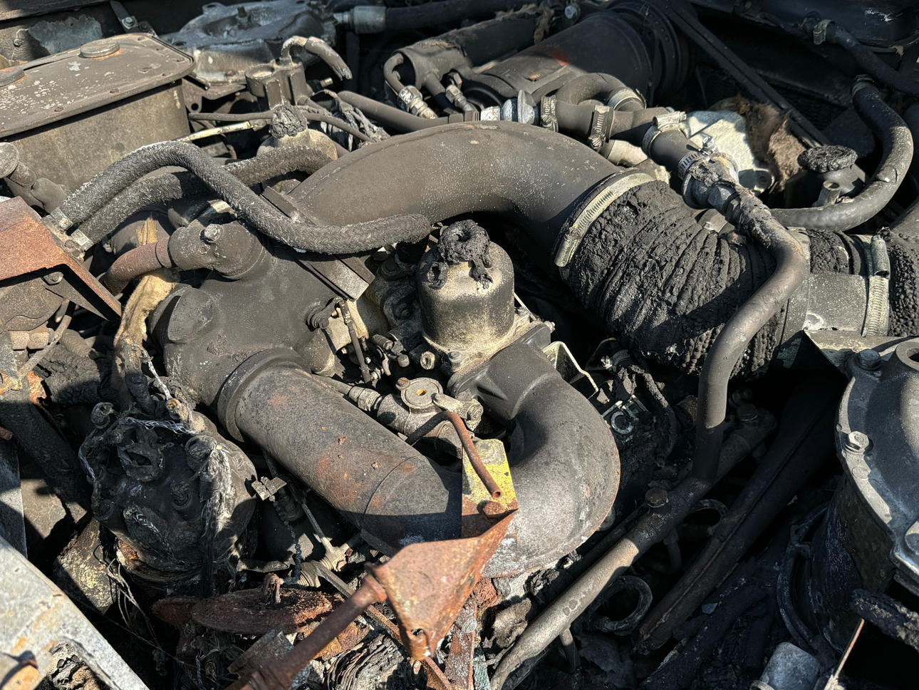 Extensive damage to the engine compartment, paintwork on and around the hood, cracked front window due to the fire.