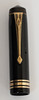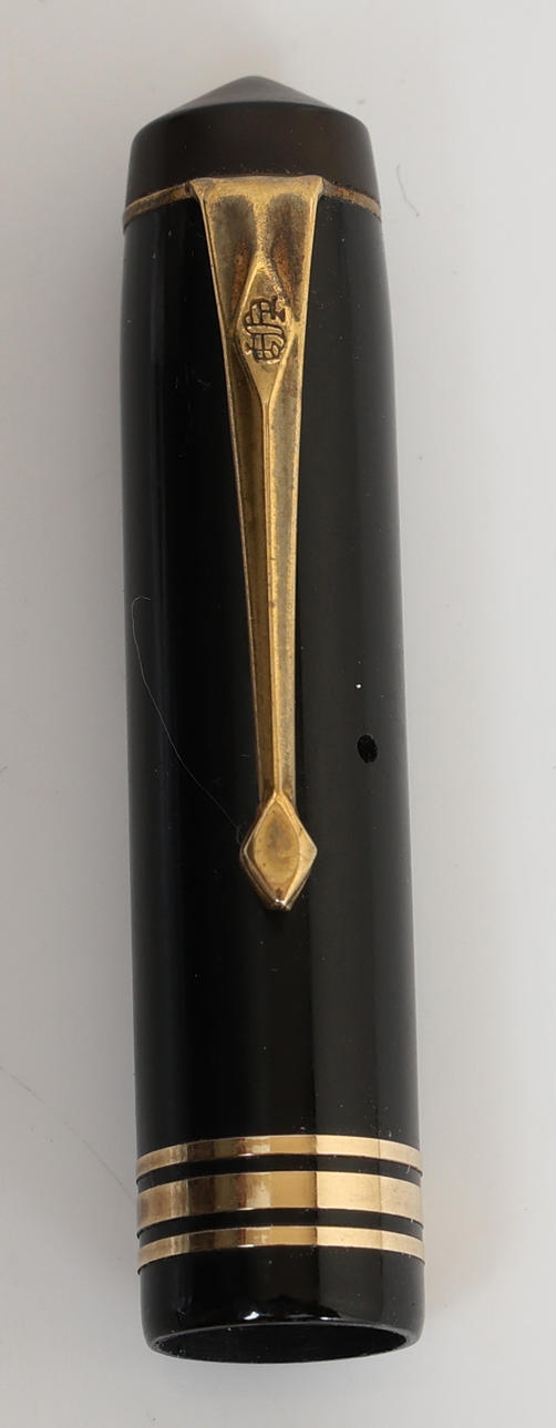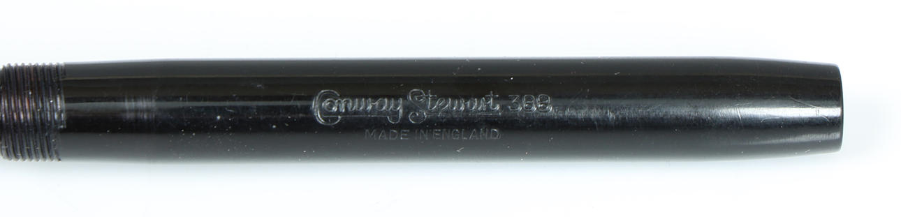 With black barrel with gold trim, the pocket clip with logo, three gold bands to the cap indicating top of the range model, the lever filler with round end, the barrel reading 'Conway Stewart 388 Made in England', the 14ct gold nib reading 'Conway Stewart 14ct', with medium point, 12.5cm long.