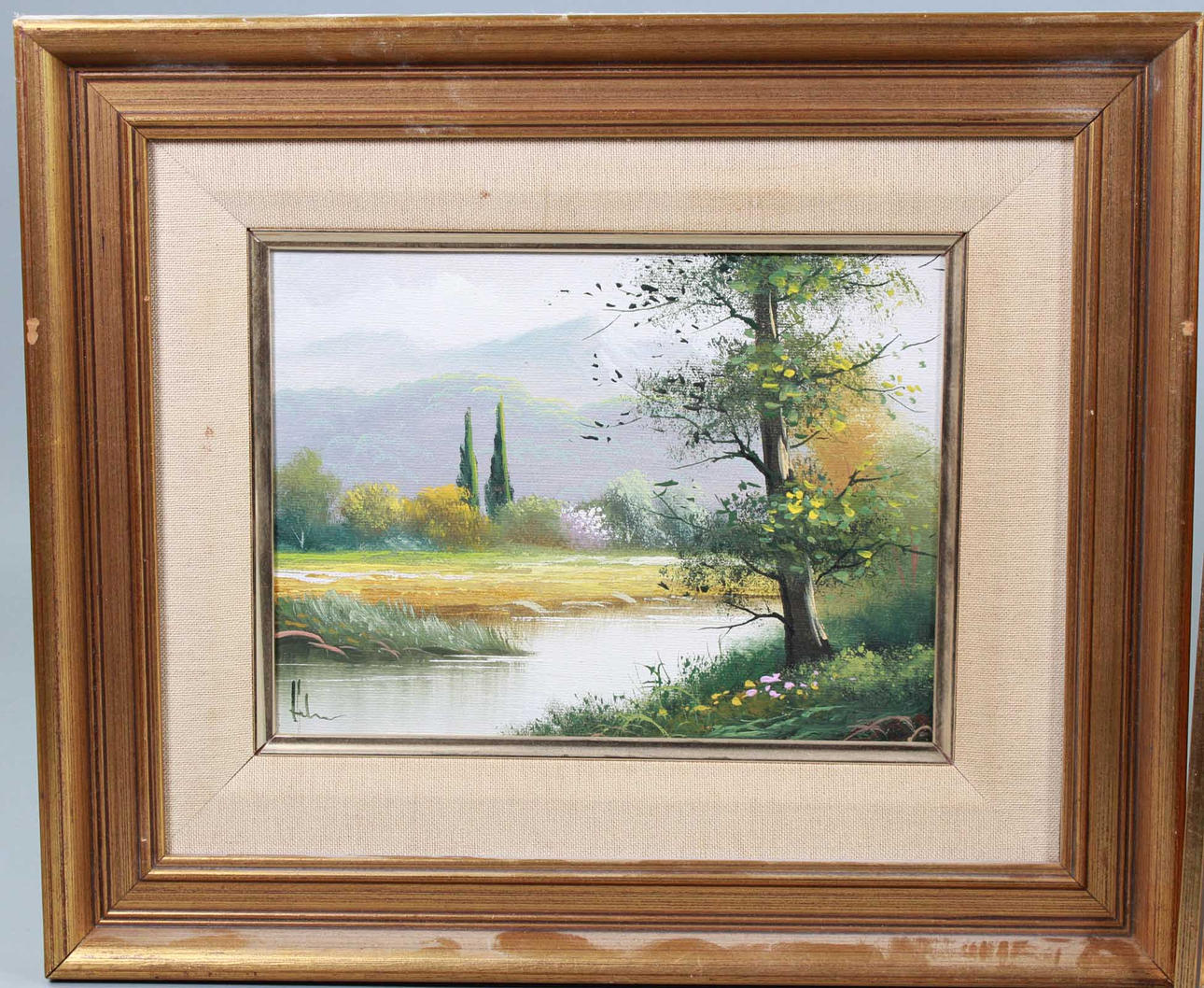 Oil on canvas, signed uninterpreted, 2 landscape landscapes with views over meadows and forests on a background of rising mountain ranges or seascape with thundering surf in the evening light, pasty brushstroke, both approx. 24 x 18 cm, each part in a linen-covered gold frame approx. 39 x 33 cm.